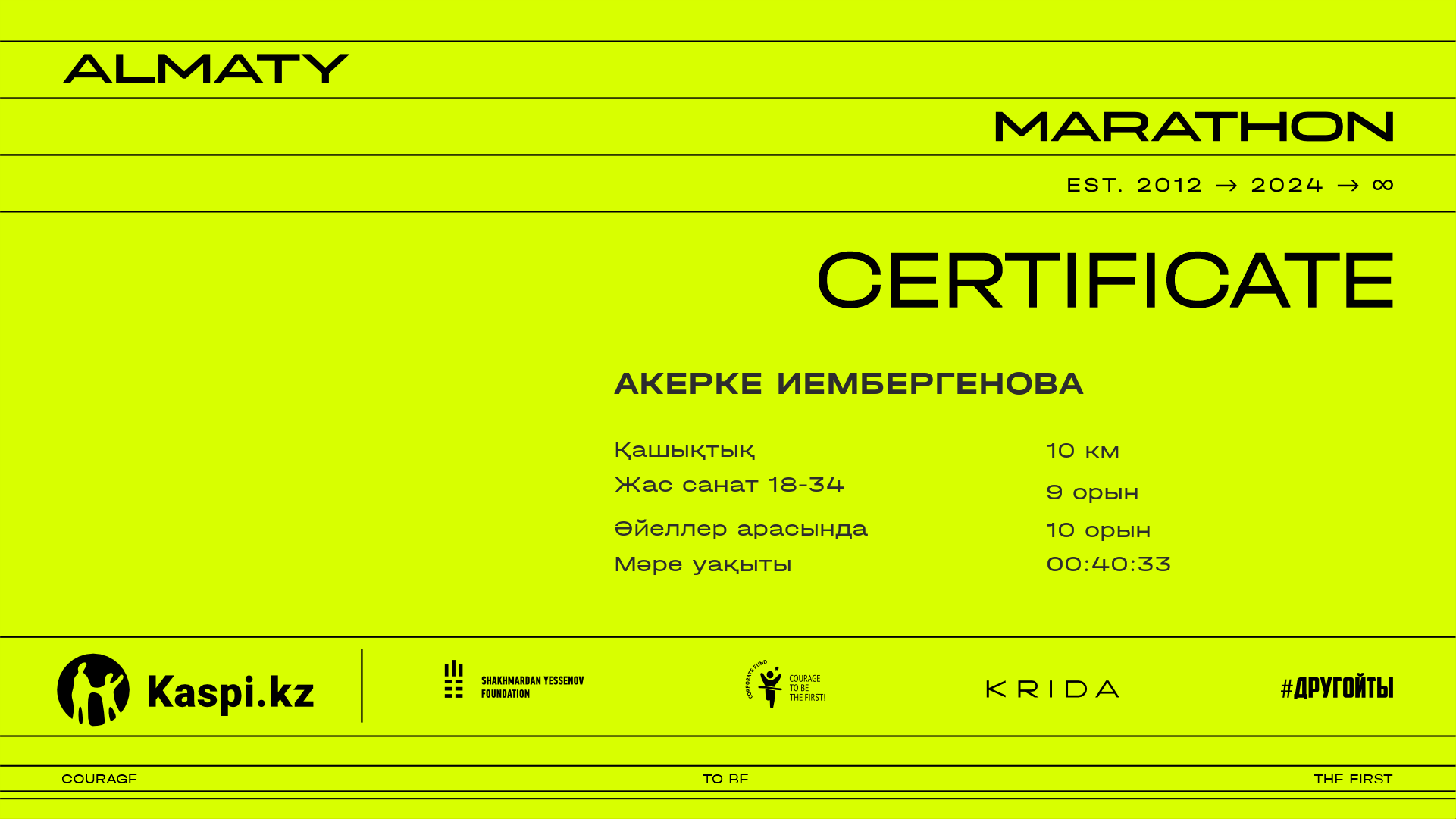 | 82 | Erasyl Toleubayev | ![]() | Караганда | 12000 | 00:35:16.40 | 00:40:21.26 | 00:40:18.46 | Жүктеп алу |