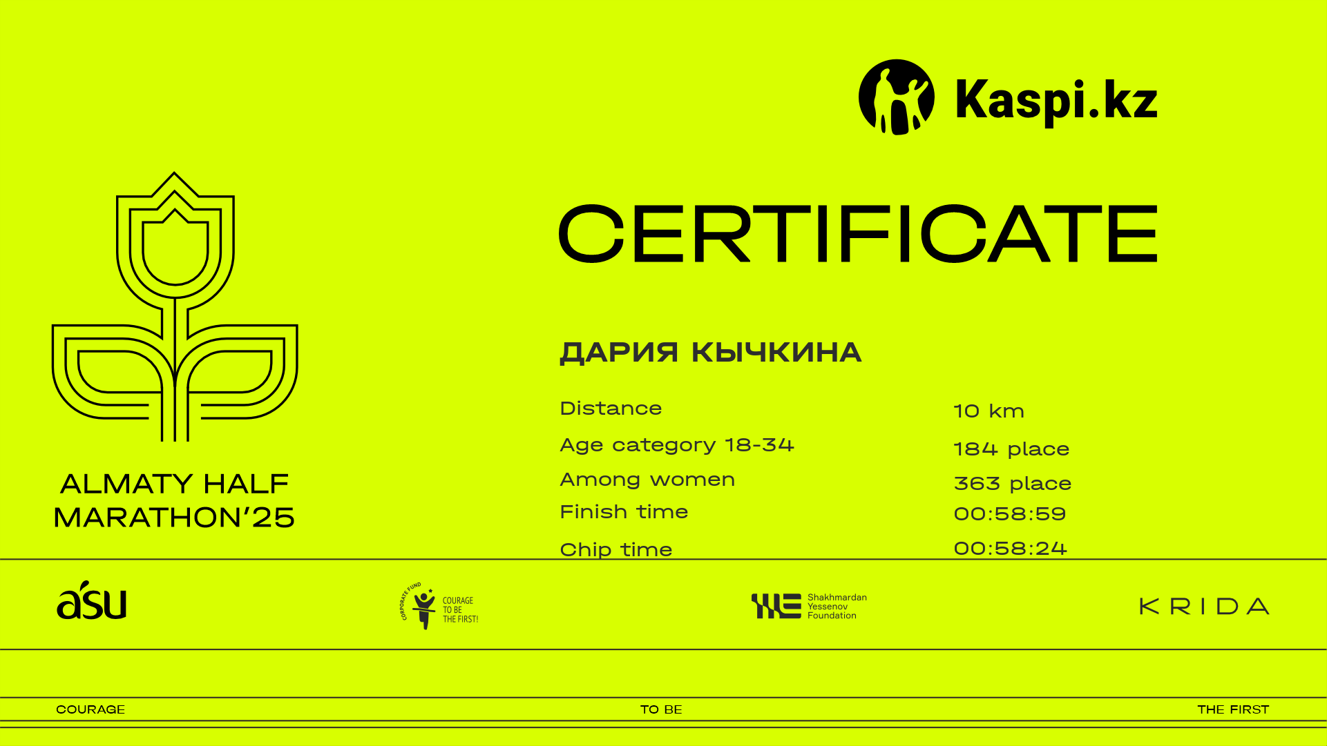 | 1332 | Дария Кычкина | ![]() | Алматы | 5509 | 00:38:49 | 00:58:59 | 00:58:24 | Download |