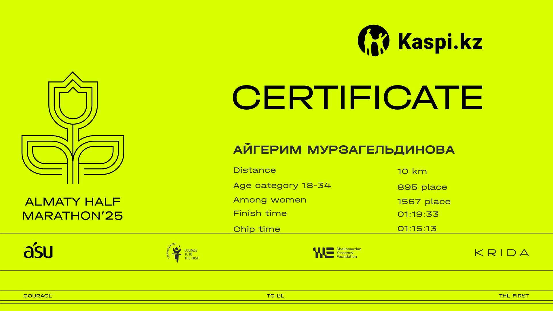 | 4883 | Малика Рыспаева | ![]() | Алматы | 10474 | 01:03:12 | 01:39:32 | 01:35:07 | Download |