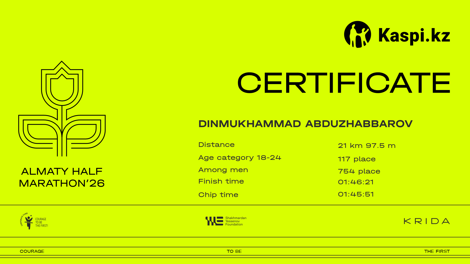 | 754 | Dinmukhammad Abduzhabbarov | ![]() | Алматы | 1573 | 00:22:44 | 00:50:34 | 01:14:12 | 01:40:53 | 01:46:21 | 01:45:51 | Download |