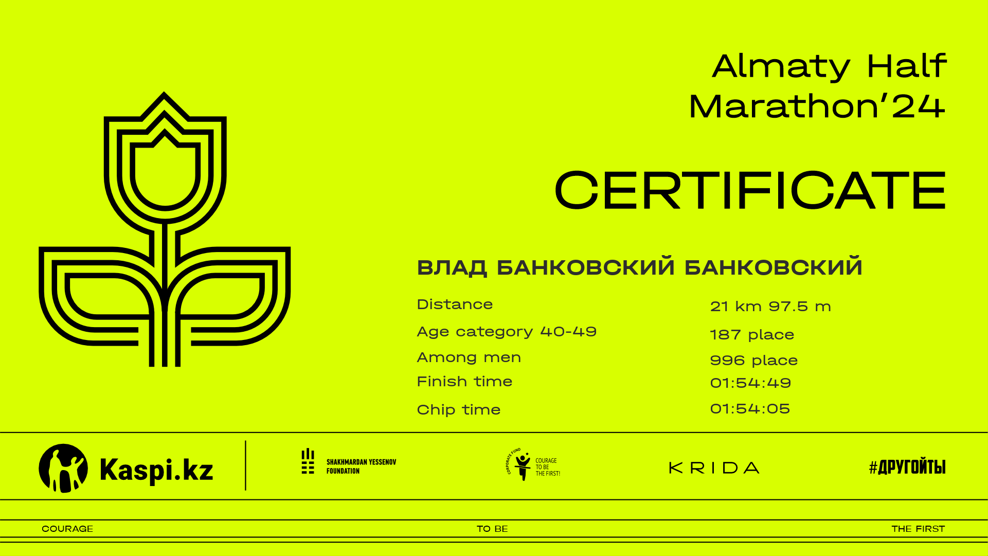 | 2154 | Askhat Shaimanov | ![]() | Алматы | 2782 | 00:25:39 | 01:06:53 | 01:40:24 | 02:15:21 | 02:21:28 | 02:21:10 | Download |