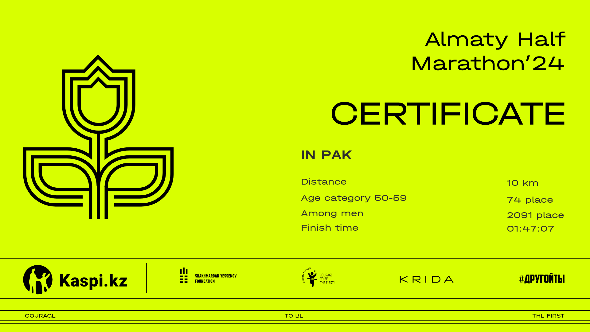 | 3803 | Iskander Aisazhanov | ![]() | Алматы | 5450 | 01:06:45 | 01:37:38 | 01:35:47 | Download |