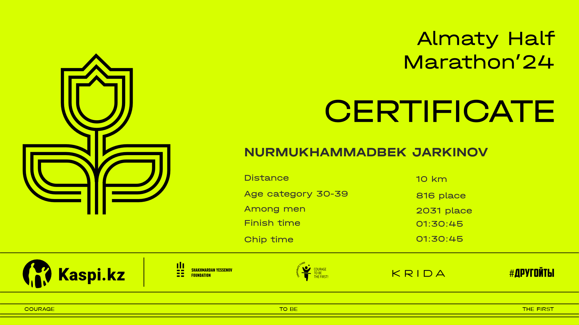 | 3726 | Динара Абдыхалыкова | ![]() | Алматы | 3558 | 01:02:24 | 01:33:52 | 01:31:28 | Download |