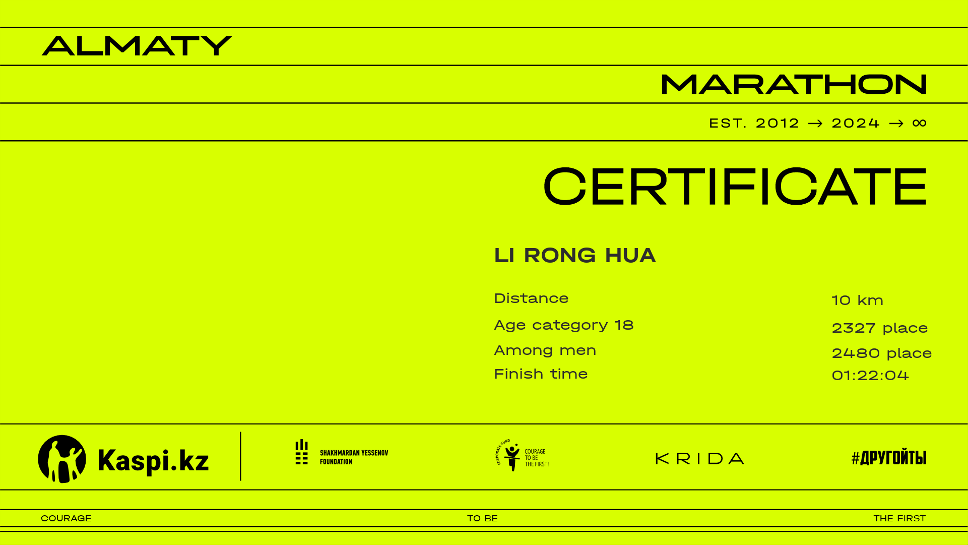 | 4174 | Hulan Unenbat | ![]() | Almaty | 8820 | 00:59:14.31 | 01:22:11.41 | 01:21:11.32 | Download |
