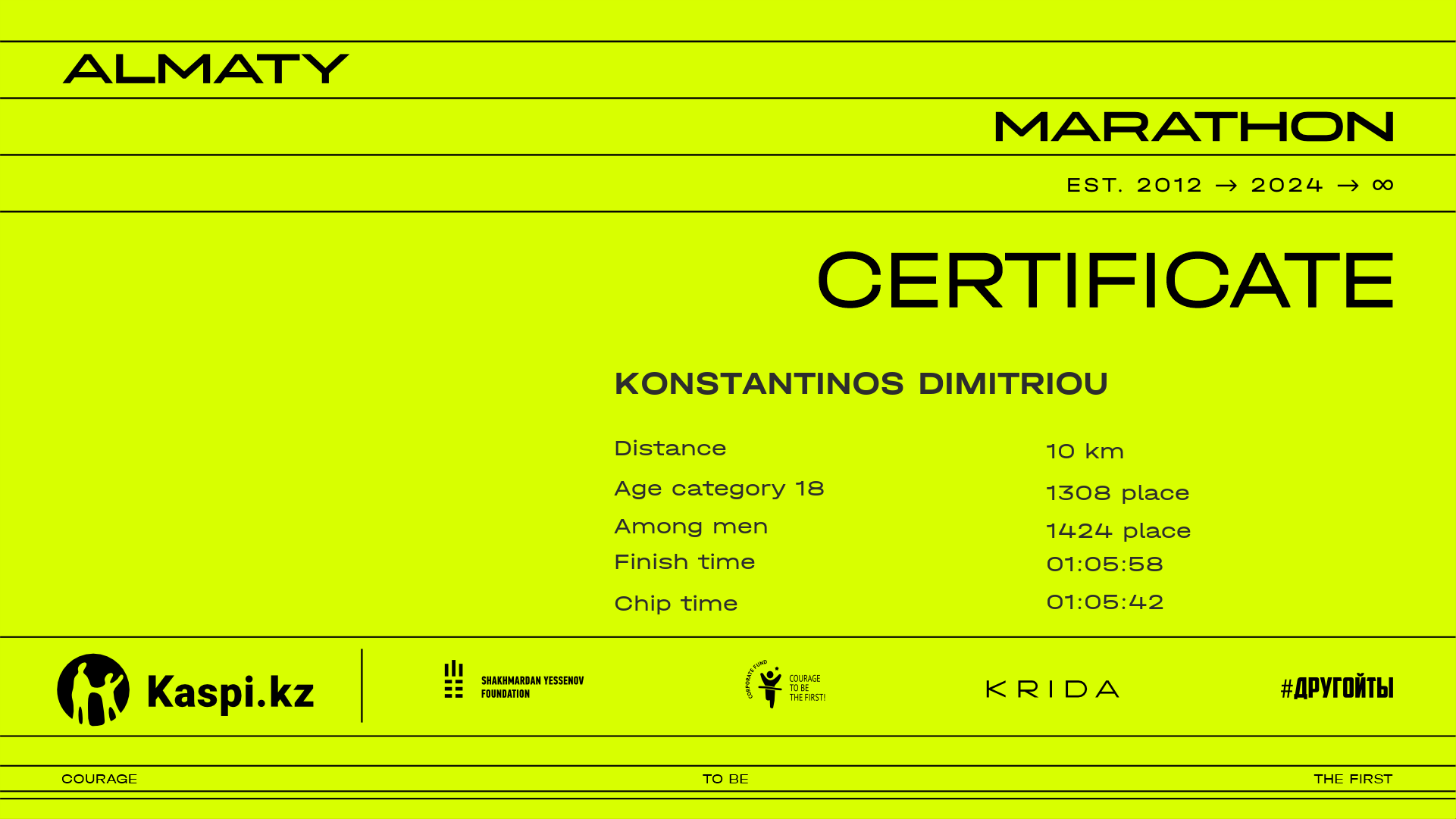 | 1866 | KONSTANTINOS DIMITRIOU | ![]() | ALMATY | 7848 | 00:46:52.59 | 01:05:58.32 | 01:05:42.96 | Download |
