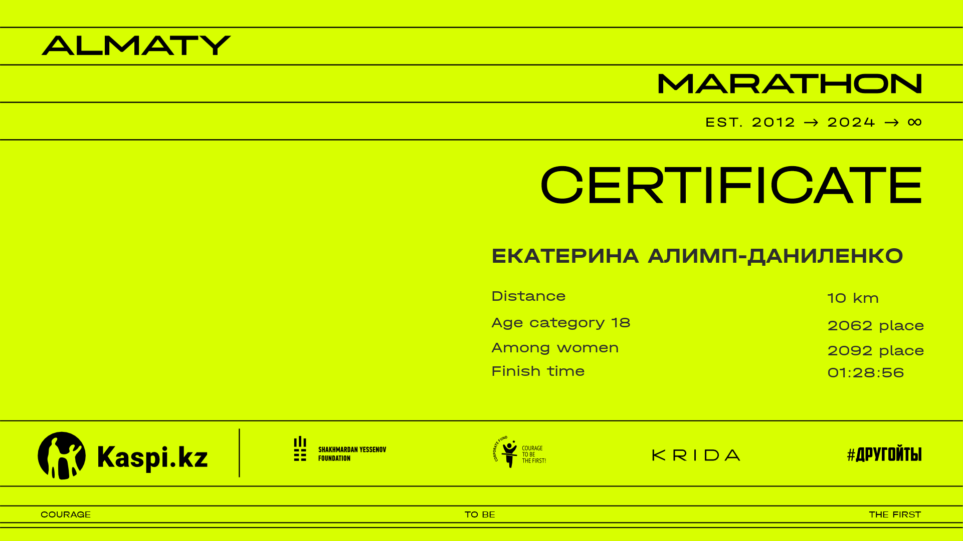 | 4775 | Екатерина Алимп-Даниленко | ![]() | Алматы | 4655 | 01:04:21.41 | 01:28:56.84 | 01:25:25.64 | Download |