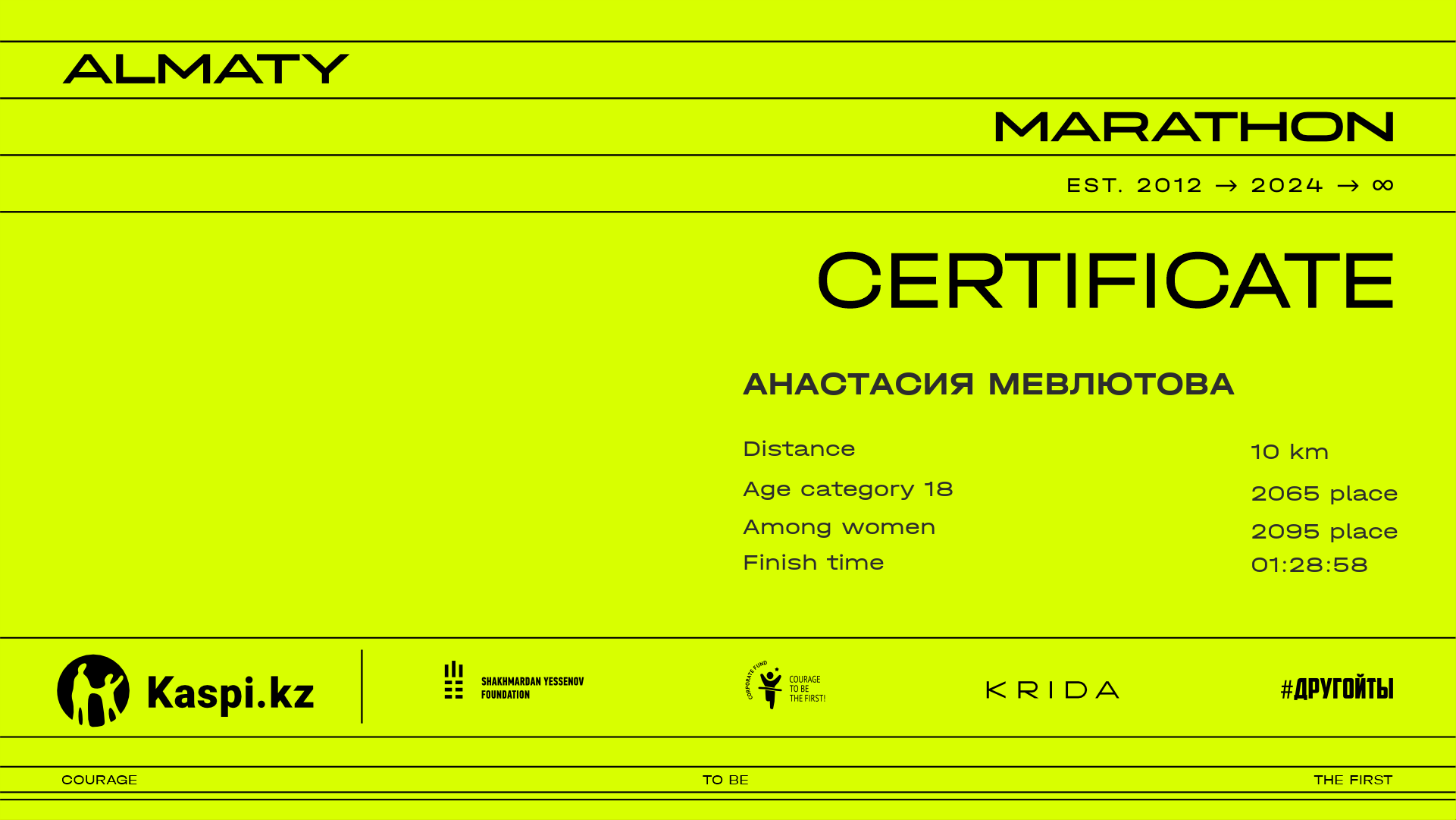| 4764 | Салтанат Апазова | ![]() | Алматы | 7099 | 01:05:42.95 | 01:28:47.88 | 01:27:13.59 | Download |