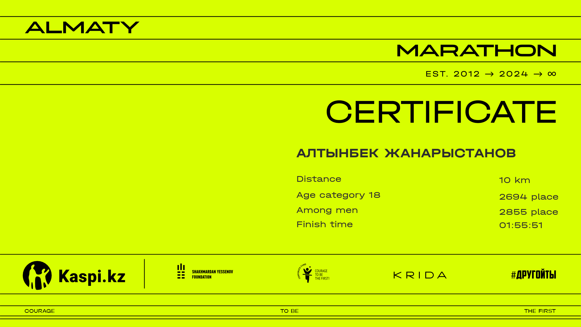 | 5518 | Алтынбек Жанарыстанов | ![]() | Алматы | 7189 | 01:25:29.37 | 01:55:51.89 | 01:51:52.99 | Download |