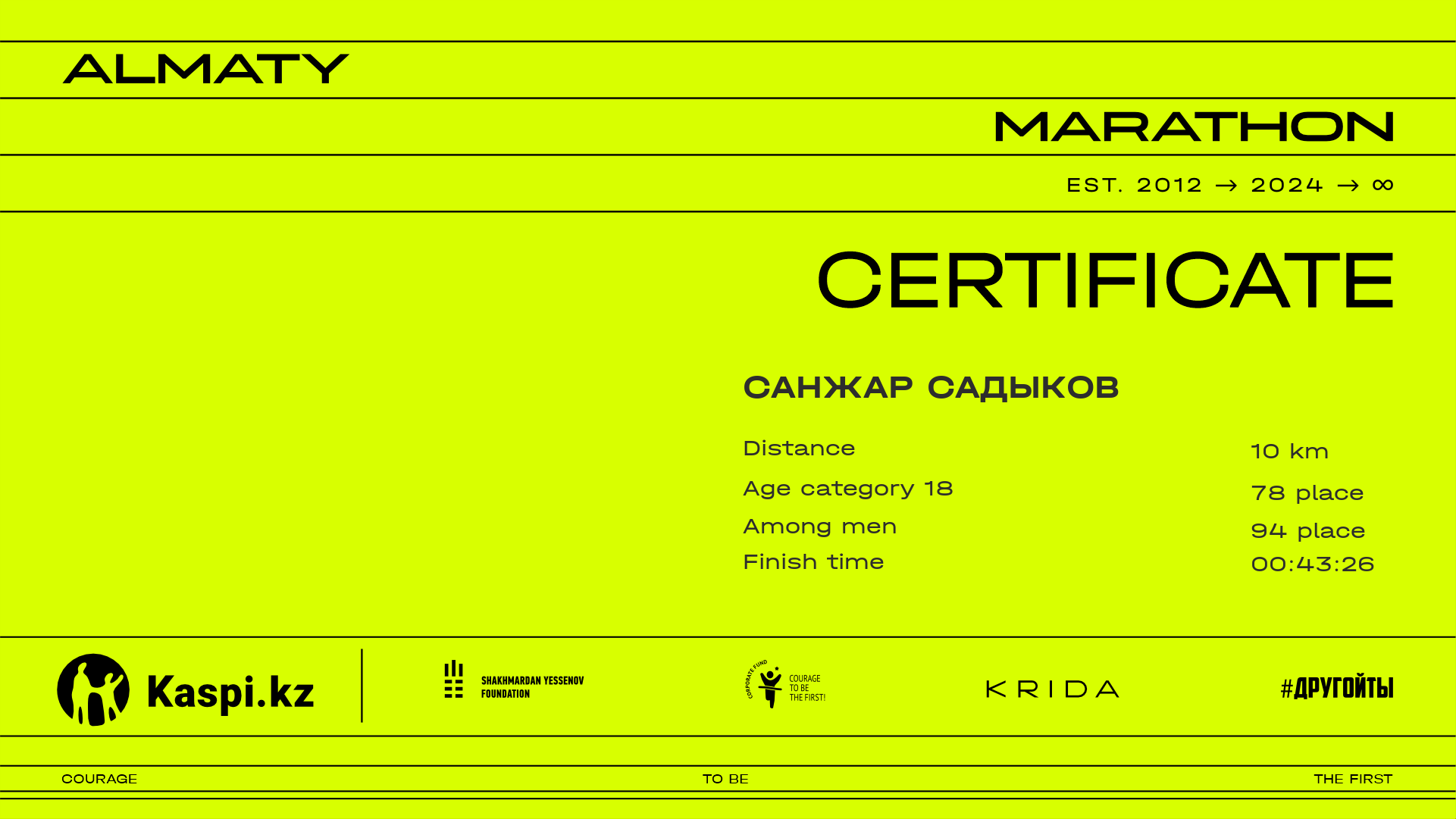 | 104 | Санжар Садыков | ![]() | Алматы | 9197 | 00:30:52.04 | 00:43:26.03 | 00:43:25.35 | Download |