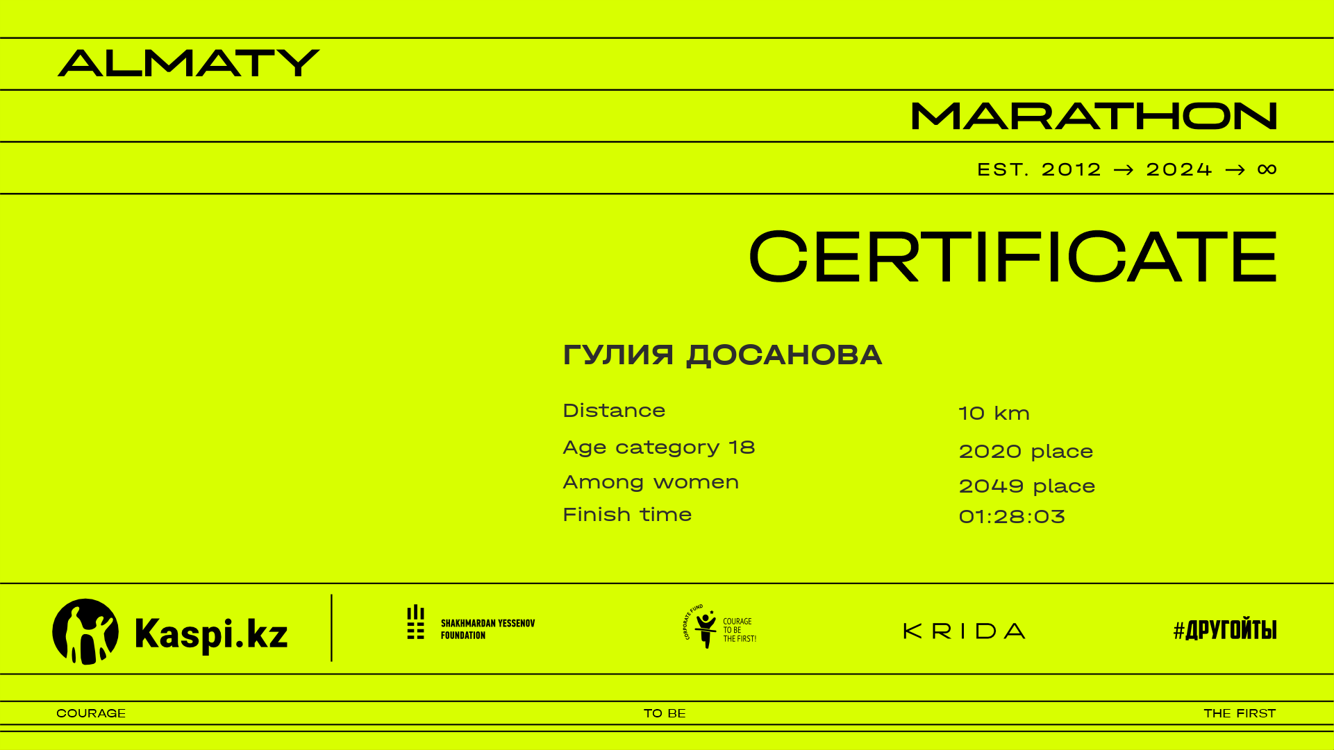 | 4243 | Karlygash Orazbayeva | ![]() | Алматы | 9966 | 01:03:12.87 | 01:22:56.66 | 01:20:17.91 | Download |
