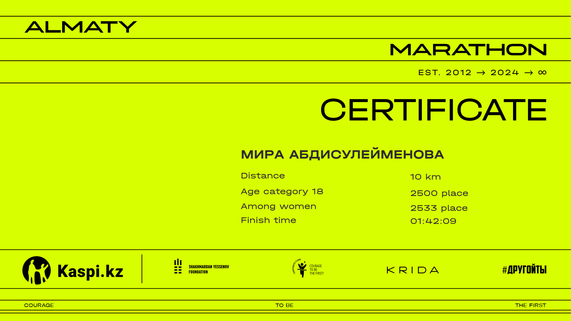| 5369 | Zhanel Serikbay | ![]() | Almaty | 4295 | 01:16:43.54 | 01:42:53.25 | 01:42:01.96 | Download |
