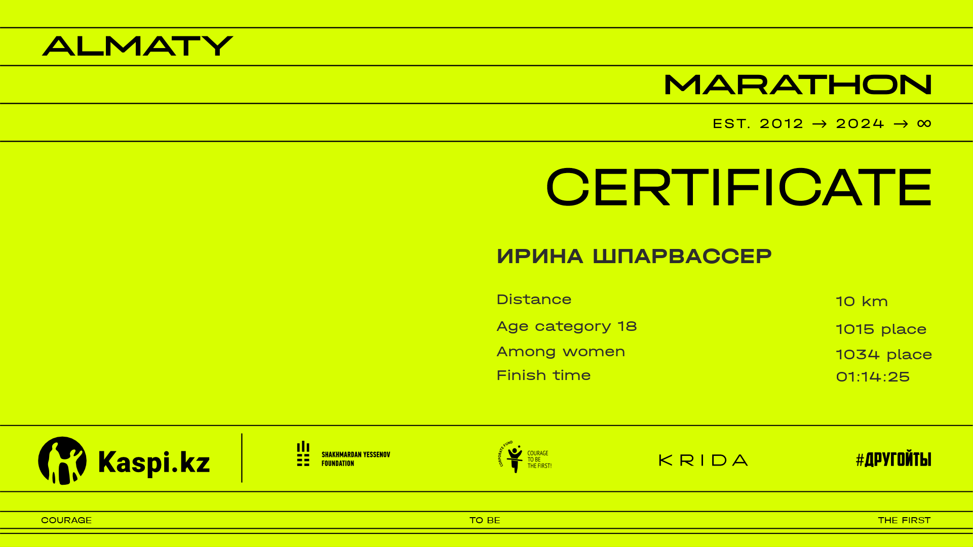 | 2025 | Ирина Лазарева | ![]() | Алматы | 7132 | 00:49:59.08 | 01:07:07.56 | 01:03:58.15 | Download |