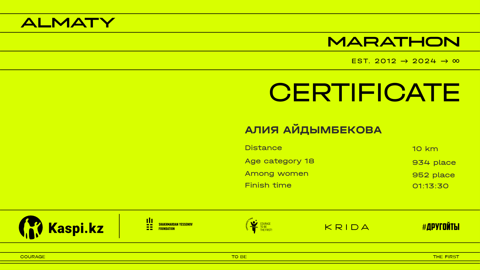 | 2993 | Алия Айдымбекова | ![]() | Алматы | 8710 | 00:53:50.35 | 01:13:30.12 | 01:11:25.72 | Download |