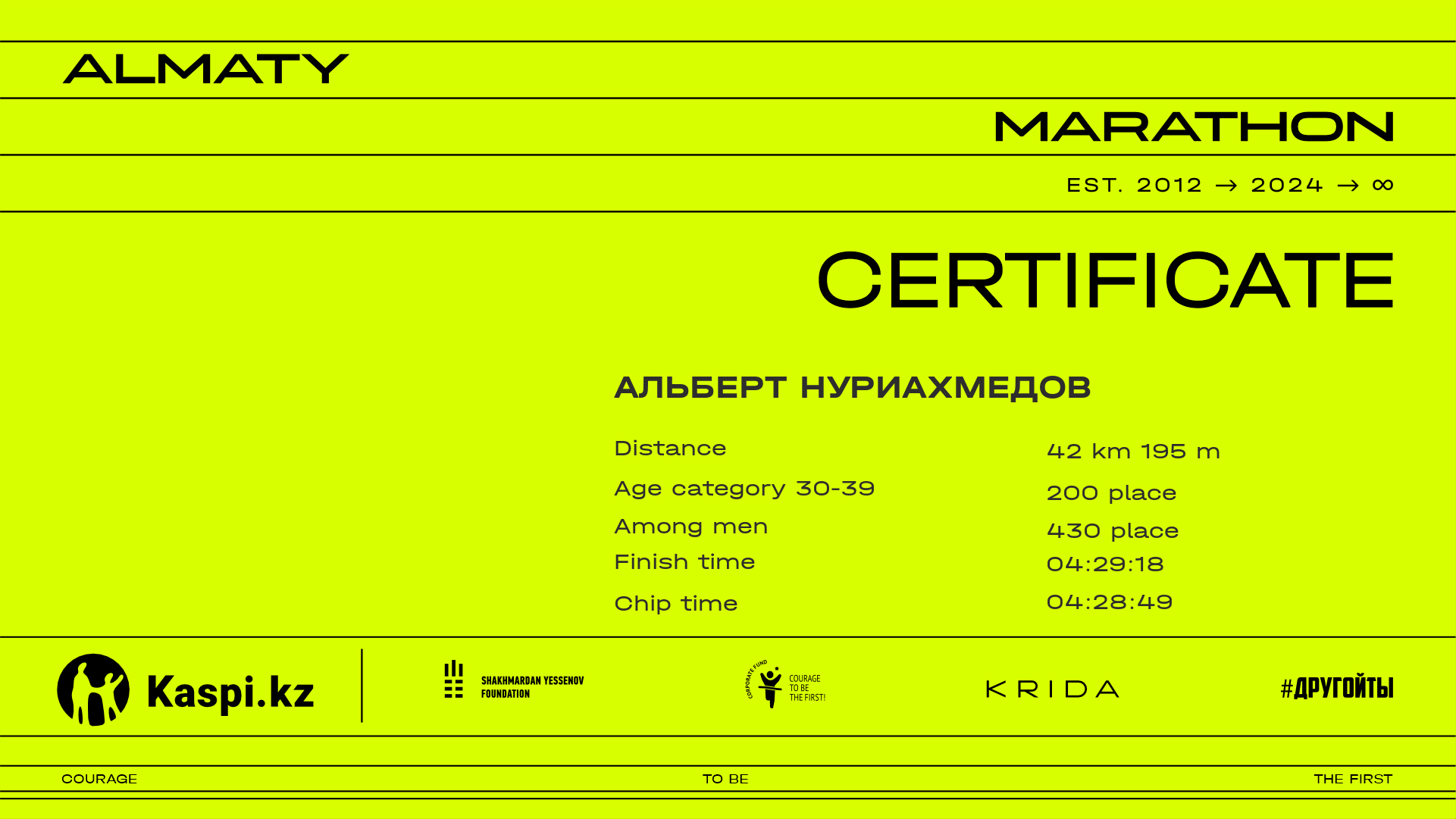 | 678 | Жандос Жуманов | ![]() | Алматы | 944 | 01:02:48.40 | 01:24:27.82 | 02:18:29.01 | 02:26:05.12 | 03:39:58.55 | 05:12:43.52 | 05:12:11.97 | Download |