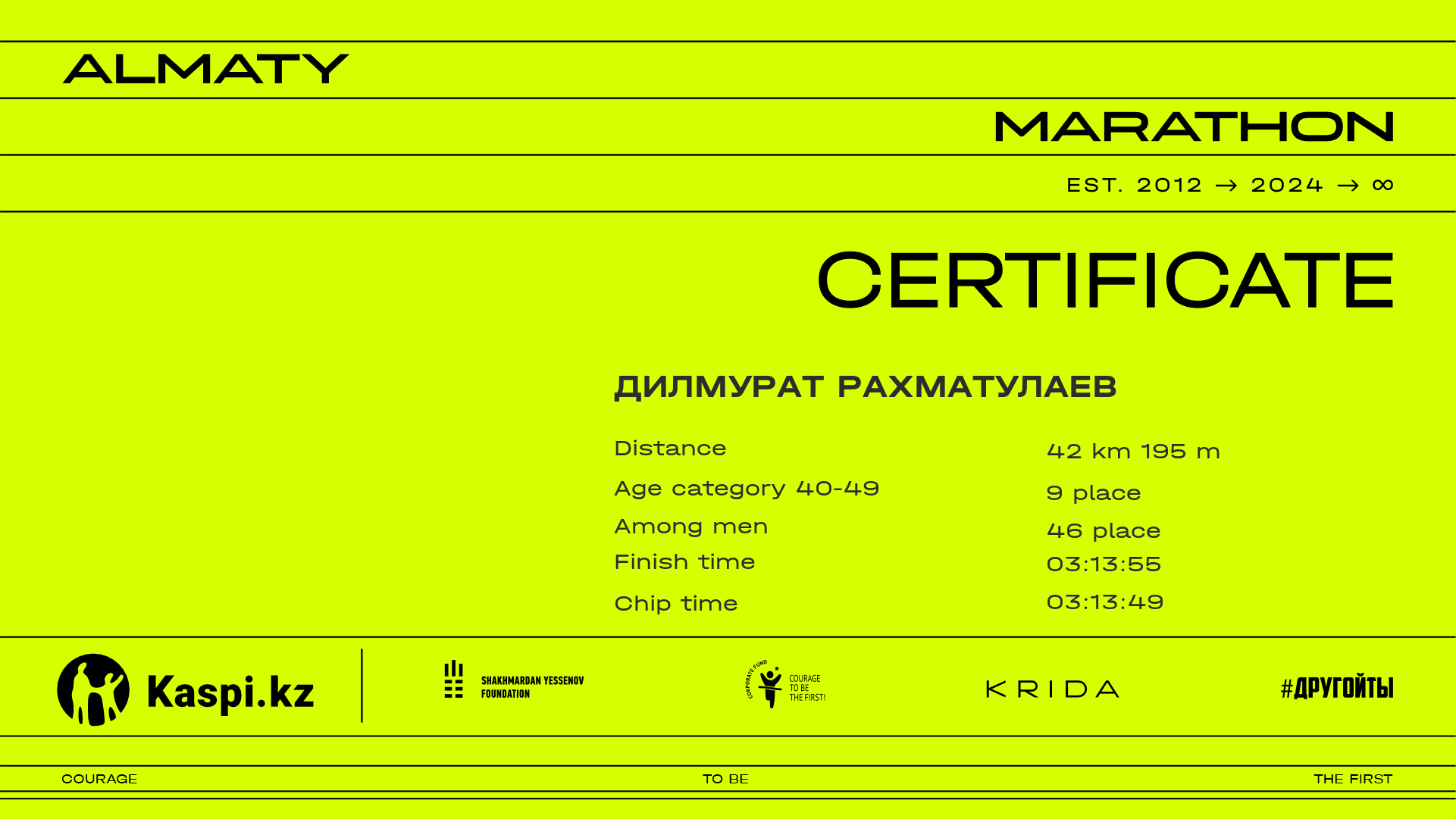 | 60 | Ерболат Омирзаков | ![]() | Алматы | 35 | 00:42:12.07 | 00:56:37.10 | 01:30:40.81 | 01:36:05.66 | 02:20:42.27 | 03:19:15.30 | 03:19:13.20 | Download |