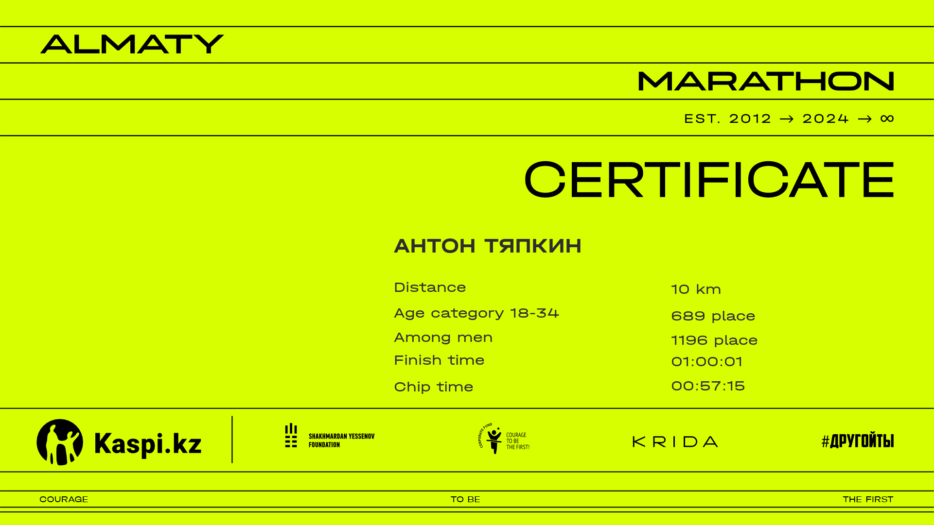 | 7057 | Рүстем Мұқанғали | ![]() | Алматы | 15885 | 01:20:41.78 | 01:32:10.33 | 01:29:20.48 | Download |
