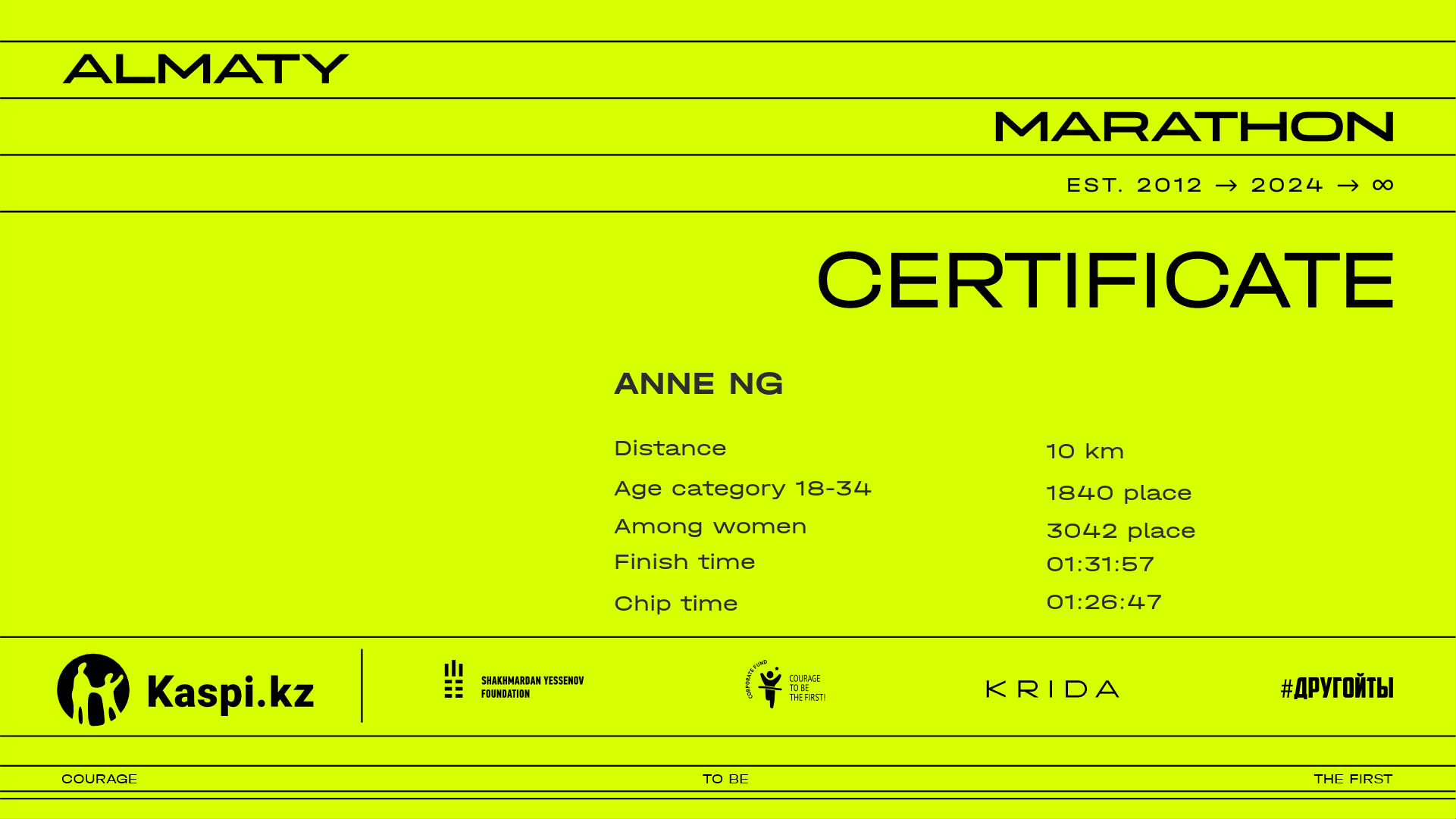 | 7684 | Anuar Zhamanbalanov | ![]() | Алматы | 7853 | 01:30:50.02 | 01:41:38.40 | 01:39:06.23 | Download |