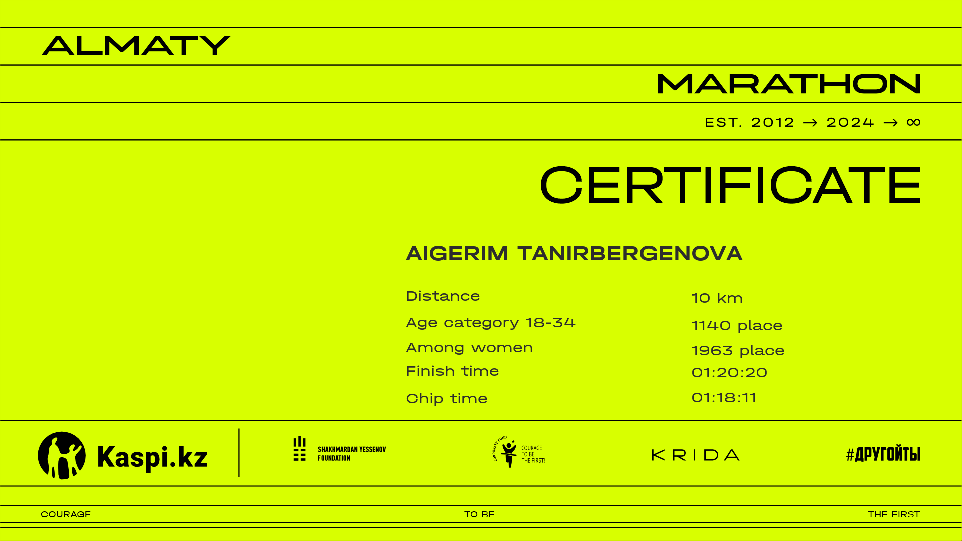 | 5603 | Jamilya Tynybekova | ![]() | Алматы | 15815 | 01:10:36.52 | 01:21:15.14 | 01:19:15.71 | Download |