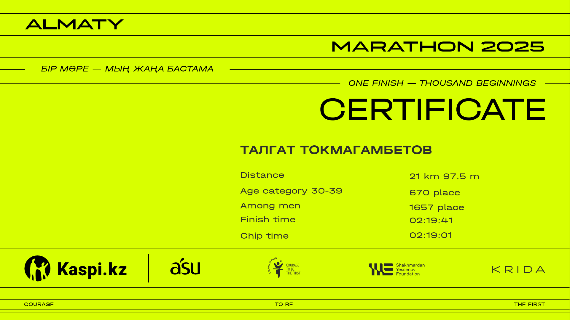 | 2062 | Талгат Токмагамбетов | ![]() | Астана | 5151 | 00:30:05 | 01:03:41 | 01:33:09 | 02:10:42 | 02:19:41 | 02:19:01 | Download |