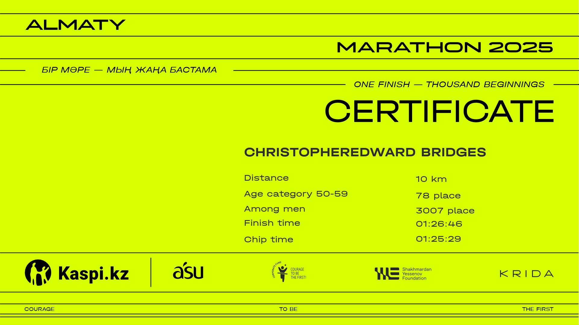 | 5261 | Олжас Нурсапин | ![]() | Алматы | 14343 | 01:15:03 | 01:24:04 | 01:23:26 | Download |