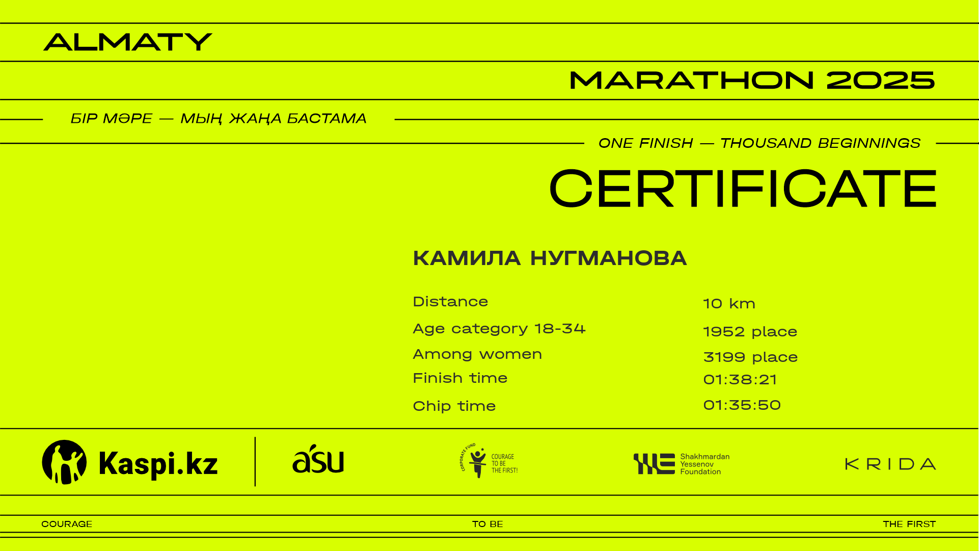 | 3211 | Amina Sagyntay | ![]() | Алматы | 10575 | 01:24:34 | 01:37:26 | 01:36:09 | Download |