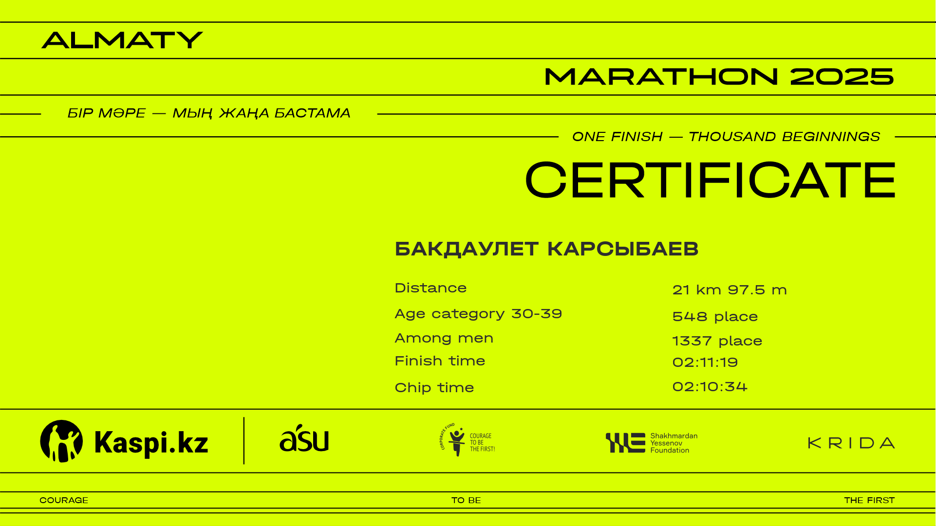 | 1624 | Бакдаулет Карсыбаев | ![]() | Алматы | 3586 | 00:32:58 | 01:04:32 | 01:32:13 | 02:04:39 | 02:11:19 | 02:10:34 | Download |