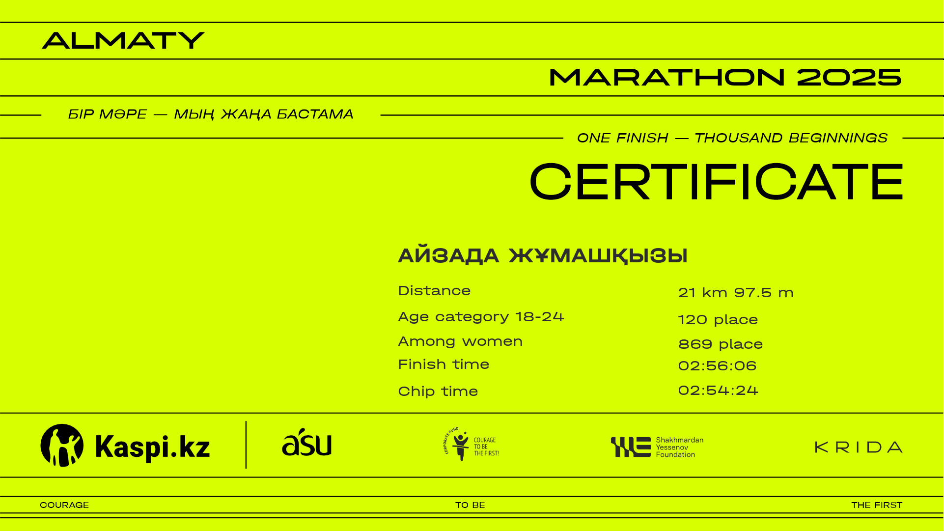 | DNF | Камила Мукарам | ![]() | Алматы | 5129 | 01:26:21 | 02:14:53 | 02:58:32 | 03:08:23 | 03:08:17 | ||