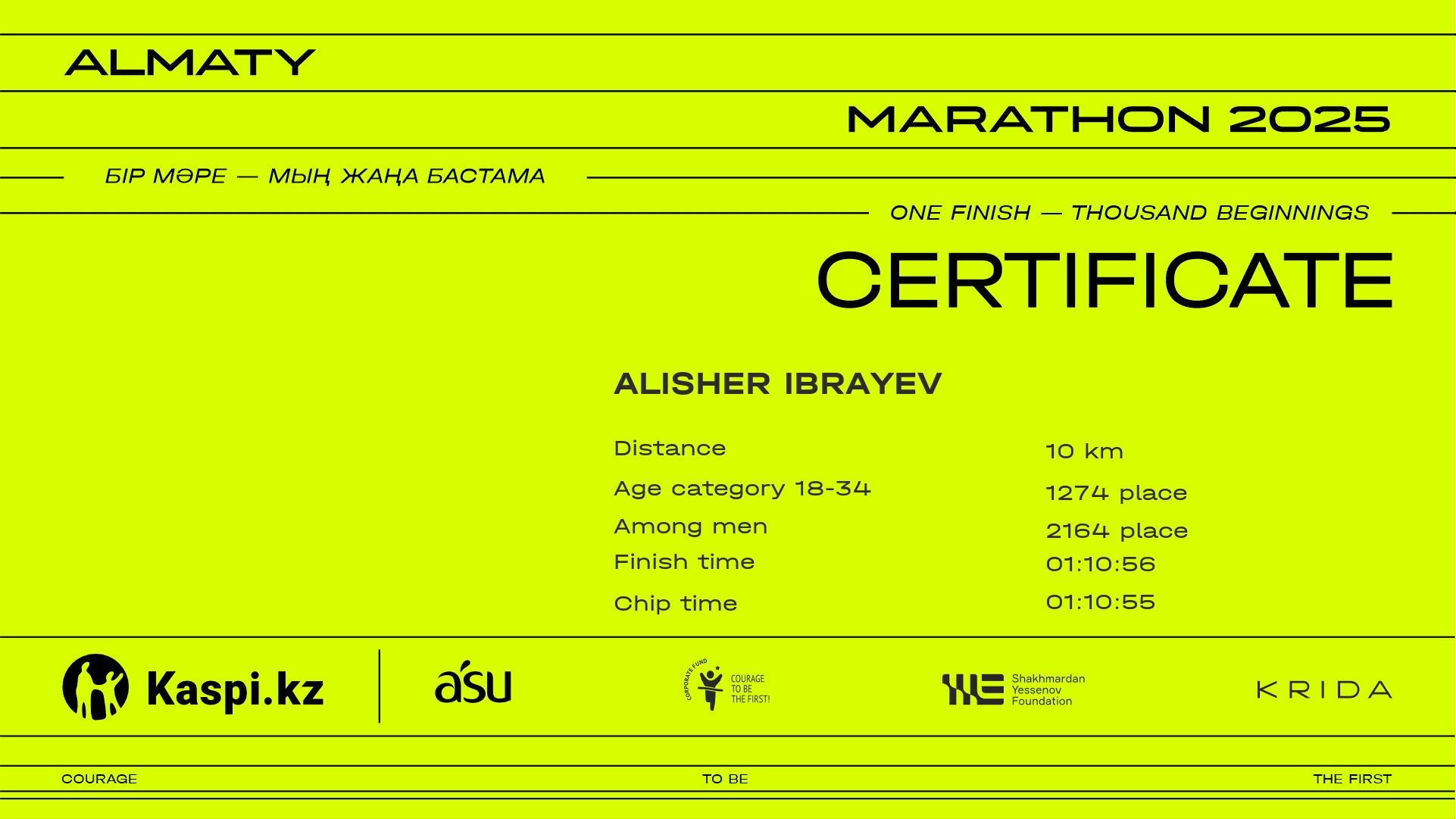 | 3041 | Alisher Meirman | ![]() | Алматы | 10145 | 01:01:15 | 01:11:28 | 01:09:51 | Download |