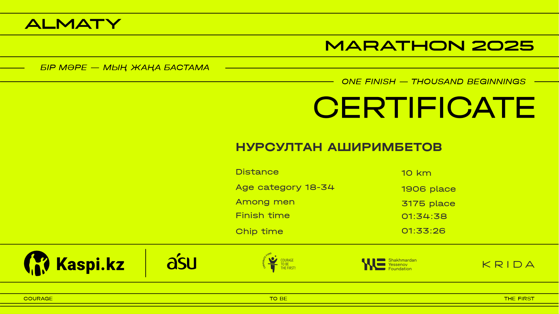 | 6228 | Нурсултан Аширимбетов | ![]() | Алматы | 11082 | 01:23:51 | 01:34:38 | 01:33:26 | Download |