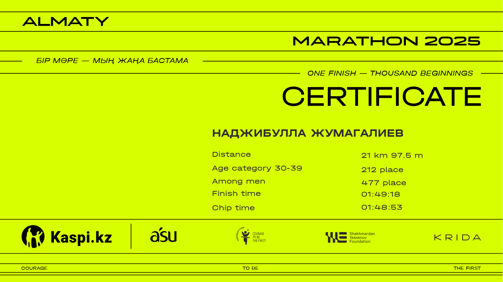 | 784 | Елжан Насипов | ![]() | Алматы | 1610 | 00:30:50 | 00:57:51 | 01:23:14 | 01:50:10 | 01:55:56 | 01:53:41 | Download |