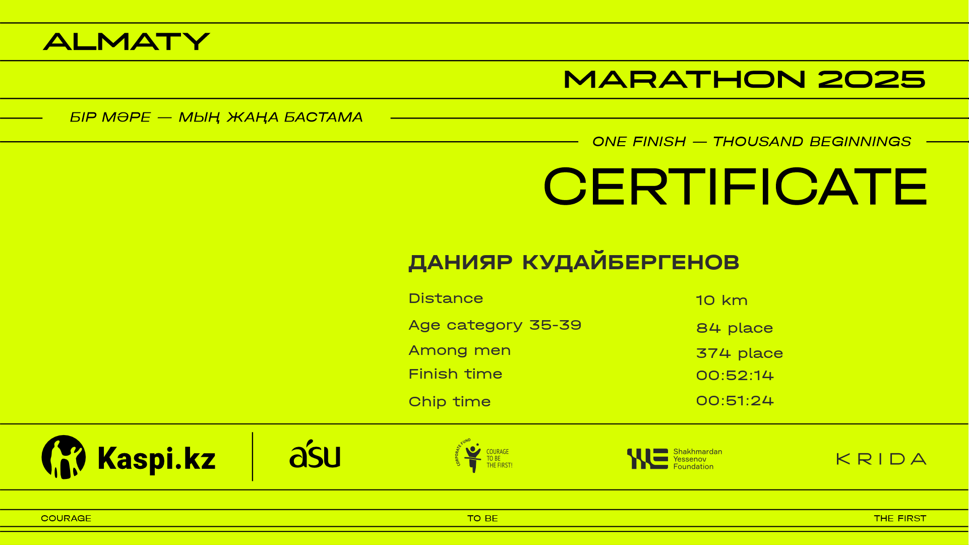 | 431 | Аскар Казиханов | ![]() | Алматы | 11250 | 00:44:35 | 00:52:29 | 00:51:06 | Download |