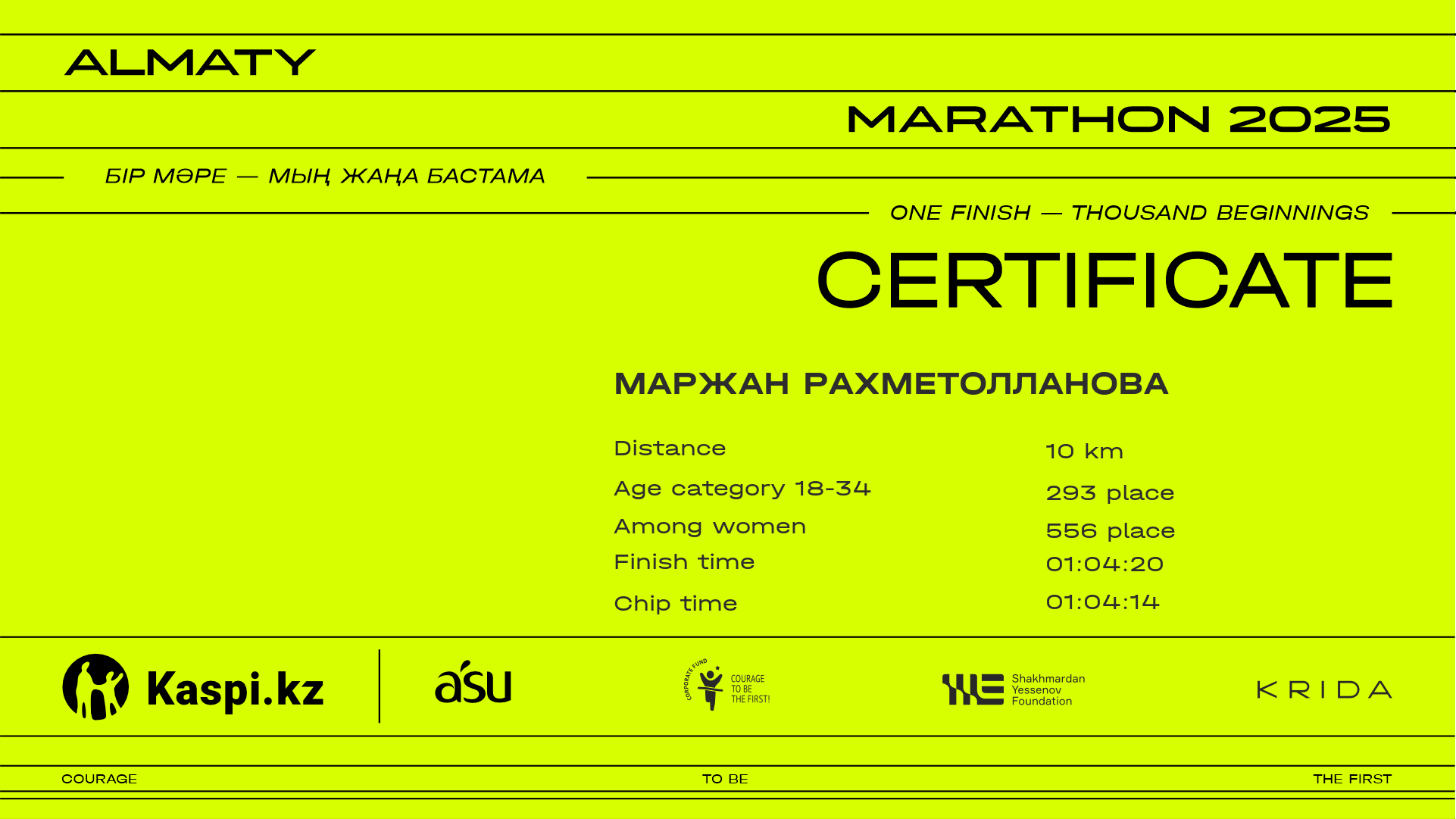 | 544 | Tolkyn Syrgabayeva | ![]() | Алматы | 6667 | 00:55:25 | 01:04:12 | 01:03:58 | Download |