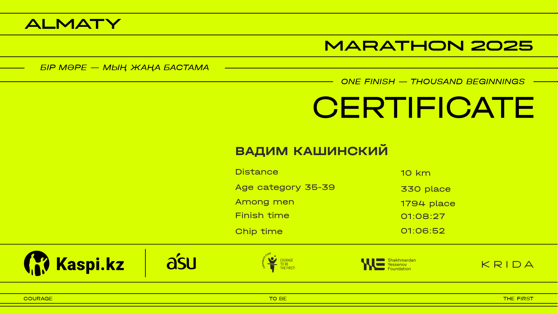 | 2510 | Вадим Кашинский | ![]() | Конаев | 11868 | 00:57:48 | 01:08:27 | 01:06:52 | Download |