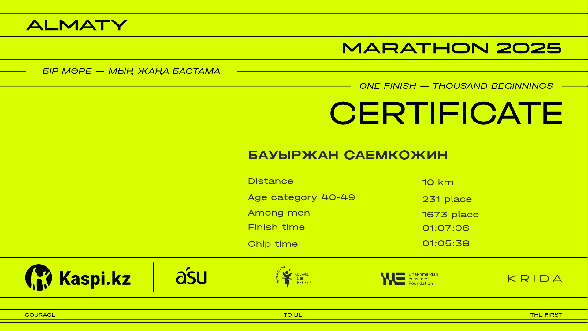 | 2301 | Алибек Ниязов | ![]() | Алматы | 11070 | 00:57:31 | 01:06:24 | 01:05:35 | Download |