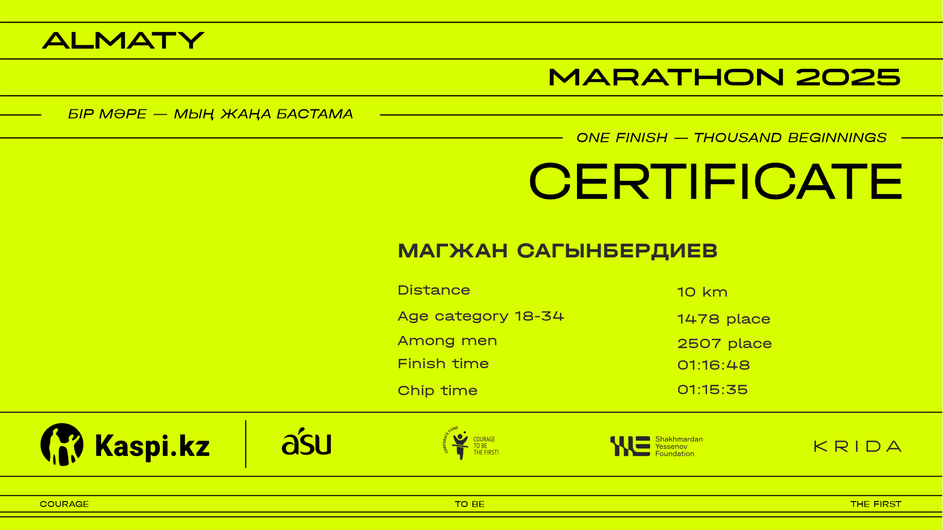 | 6039 | Ulpan Sherikhan | ![]() | Алматы | 11315 | 01:19:11 | 01:31:01 | 01:30:54 | Download |