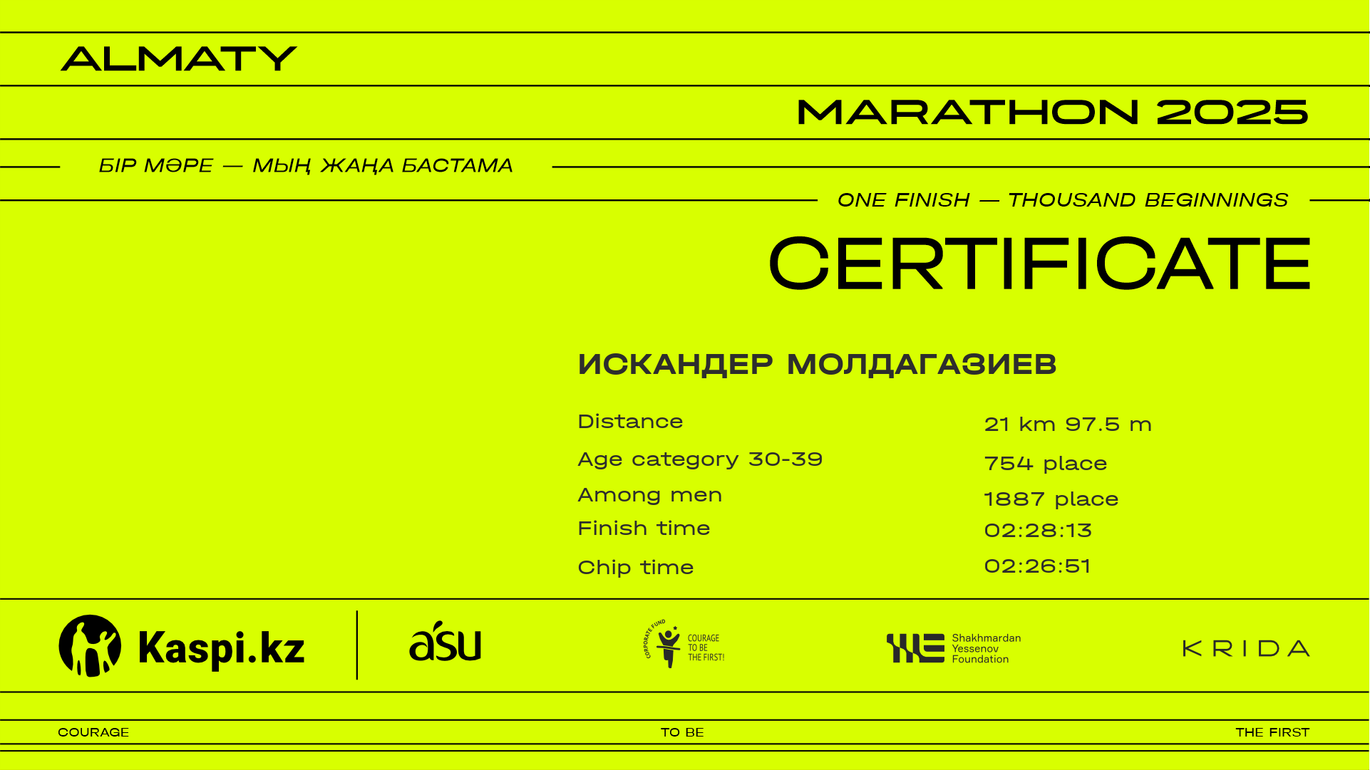 | 2760 | Ернур Ануарбеков | ![]() | Алматы | 4366 | 00:47:40 | 01:18:18 | 01:48:28 | 02:28:37 | 02:36:27 | 02:36:27 | Download |