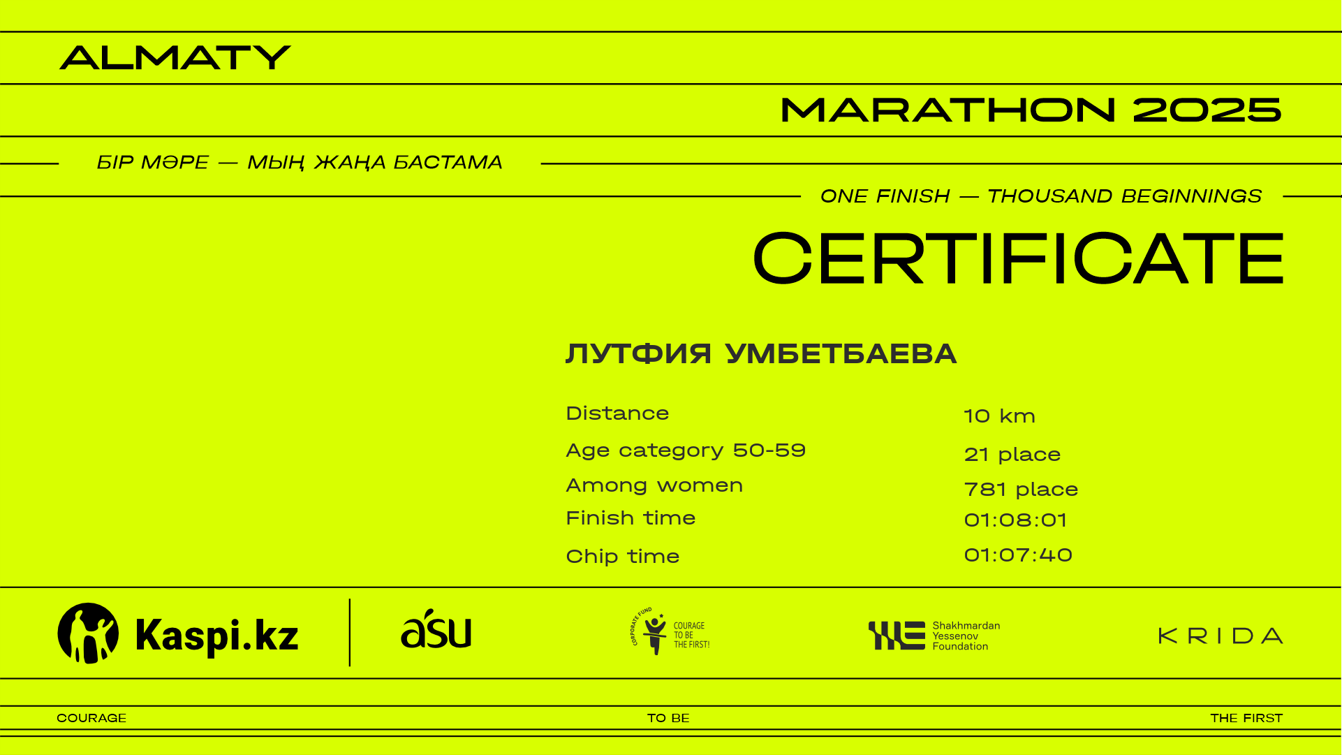 | 784 | Диана Есмуханова | ![]() | Астана | 8610 | 00:59:11 | 01:09:30 | 01:07:42 | Download |