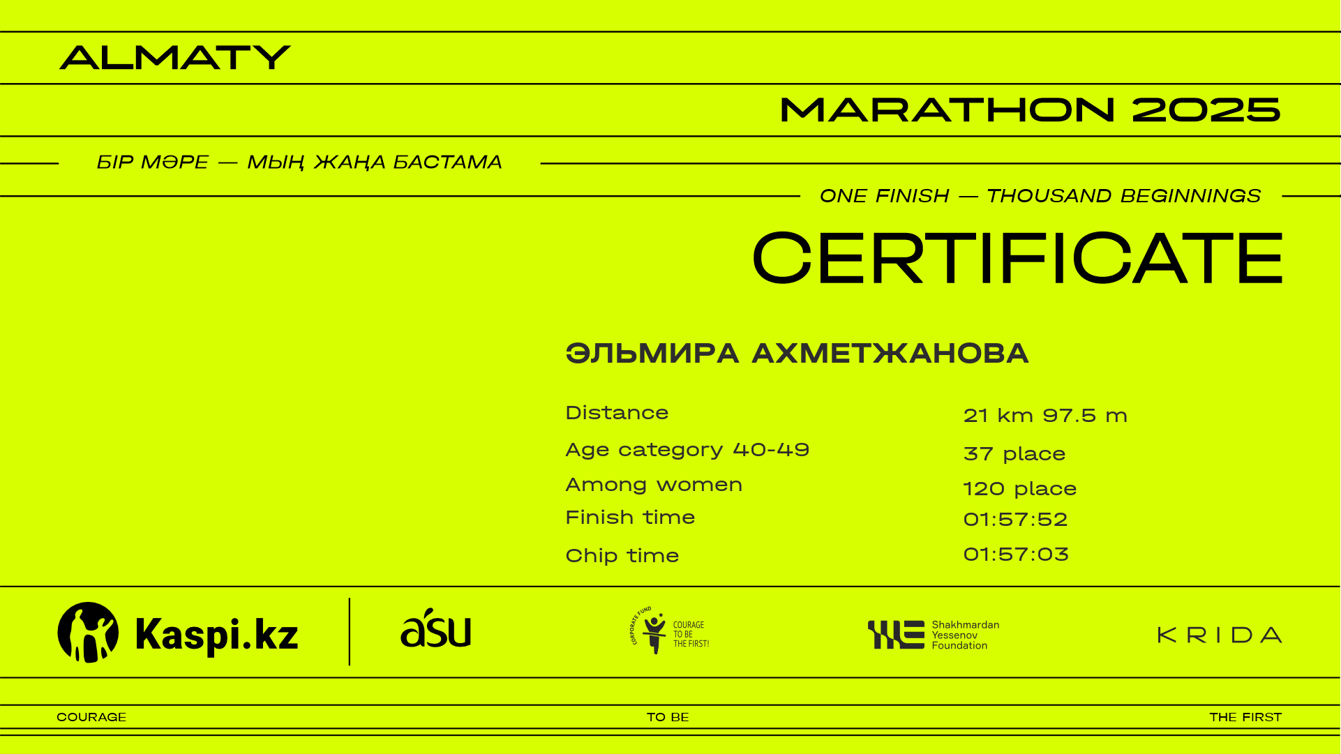 | 2458 | Эльдана Баубаева | ![]() | Алматы | 4883 | 00:33:21 | 01:09:00 | 01:42:16 | 02:20:50 | 02:29:27 | 02:28:34 | Download |