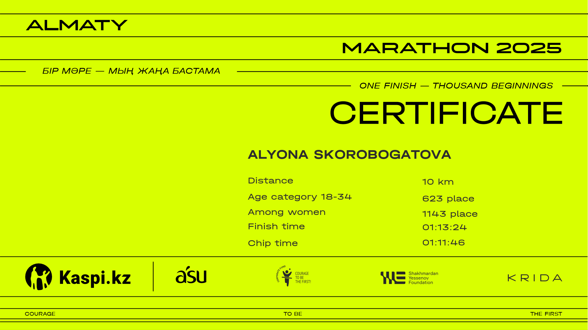| 1143 | Alyona Skorobogatova | ![]() | Алматы | 13224 | 01:02:48 | 01:13:24 | 01:11:46 | Download |