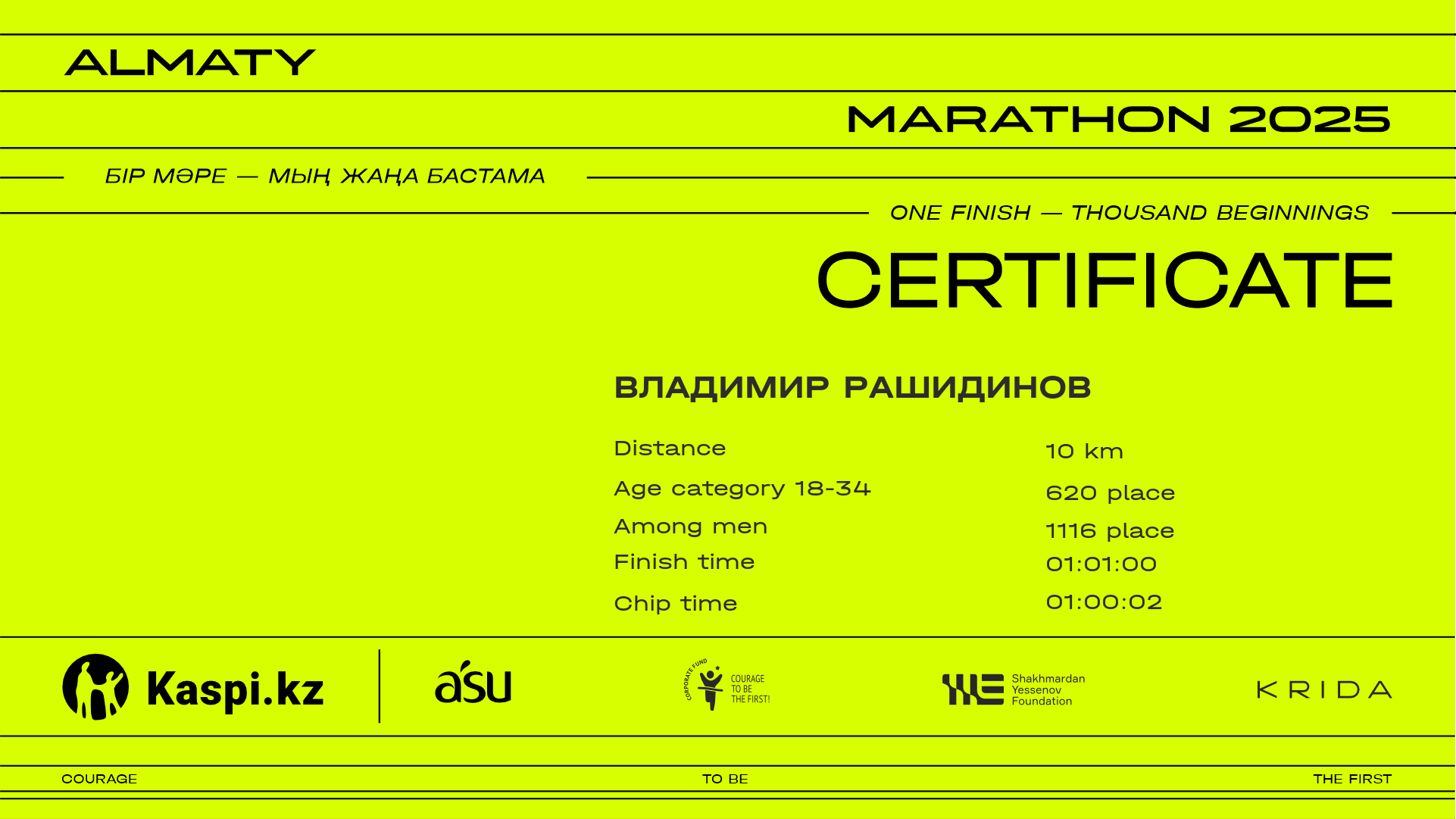 | 1418 | Akimzhan Nassyrdinov | ![]() | Алматы | 6272 | 00:53:06 | 01:00:38 | 00:59:59 | Download |
