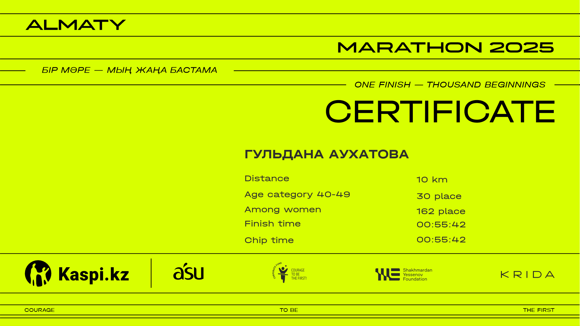 | 151 | Асель Жылкыбаева | ![]() | Алматы | 8477 | 00:49:11 | 00:56:56 | 00:55:29 | Download |