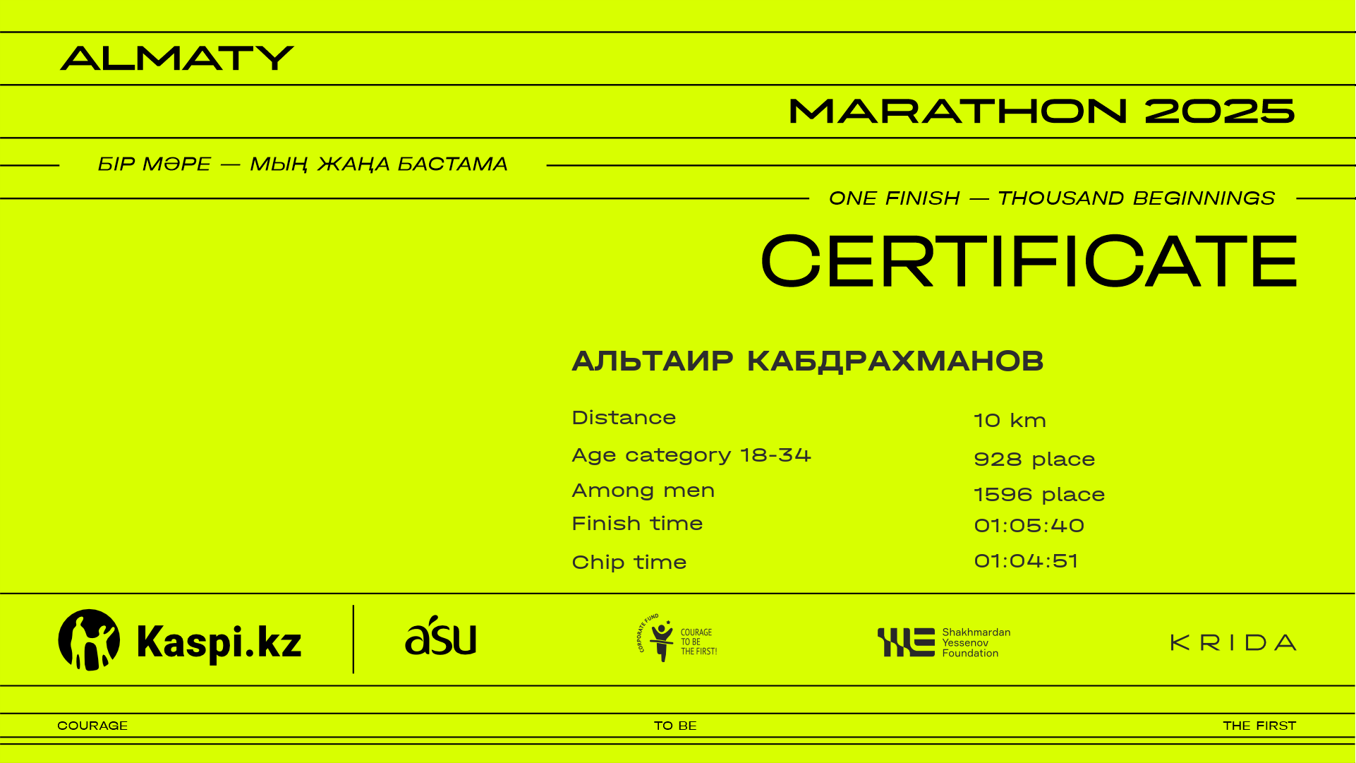 | 2206 | Dias Shulembayev | ![]() | Алматы | 7020 | 00:57:09 | 01:06:03 | 01:05:00 | Download |