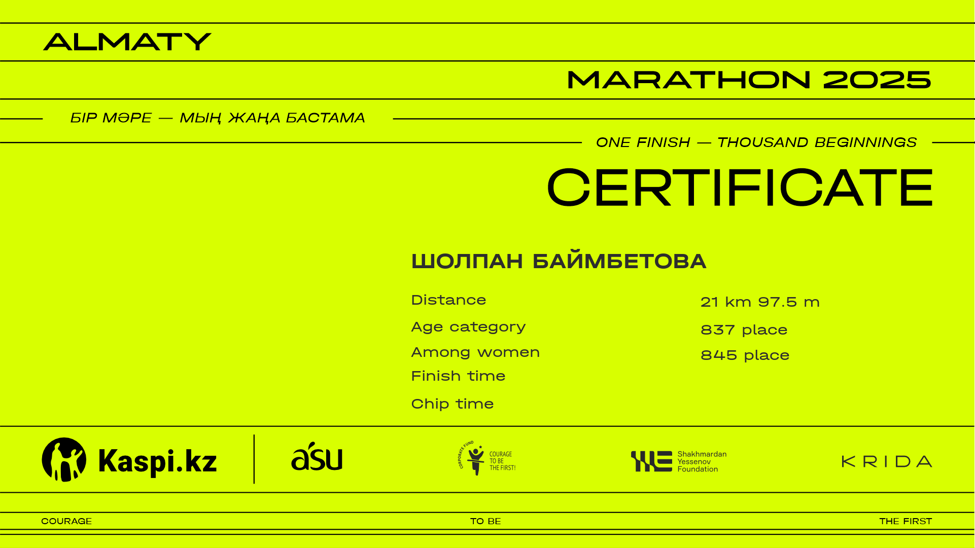 | DSQ | Akbota Tolegenova | ![]() | Алматы | 15057 | 02:06:50 | 02:06:50 | |||||