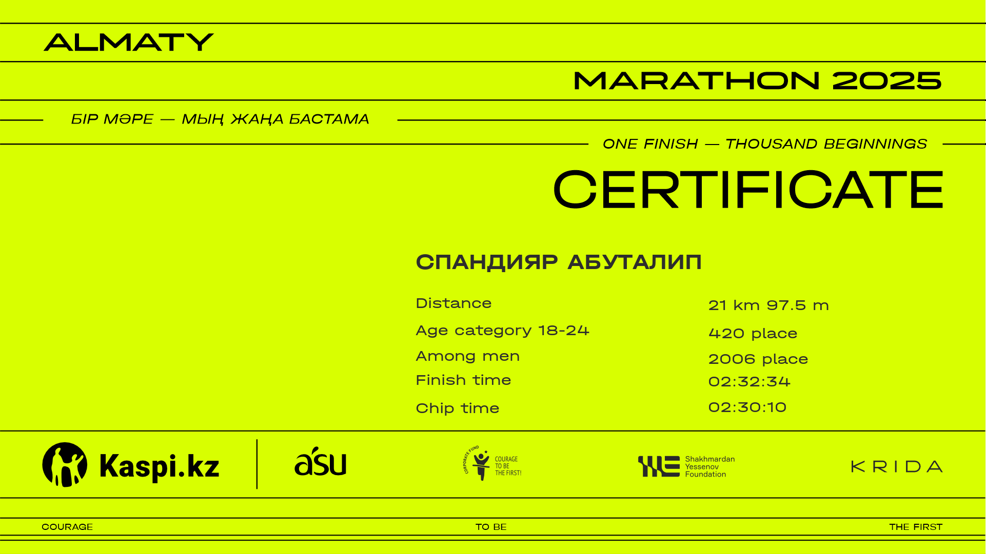 | 2585 | Спандияр Абуталип | ![]() | Алматы | 1767 | 00:35:28 | 01:09:46 | 01:42:59 | 02:24:25 | 02:32:34 | 02:30:10 | Download |