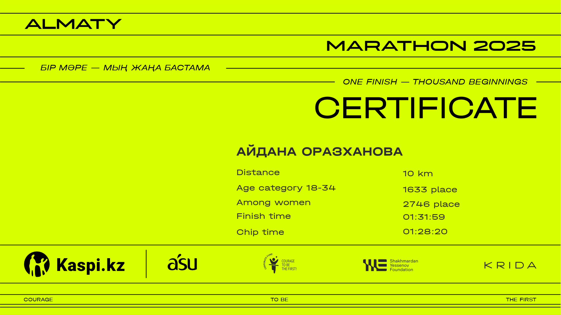 | 2746 | Айдана Оразханова | ![]() | Алматы | 8681 | 01:17:26 | 01:31:59 | 01:28:20 | Download |