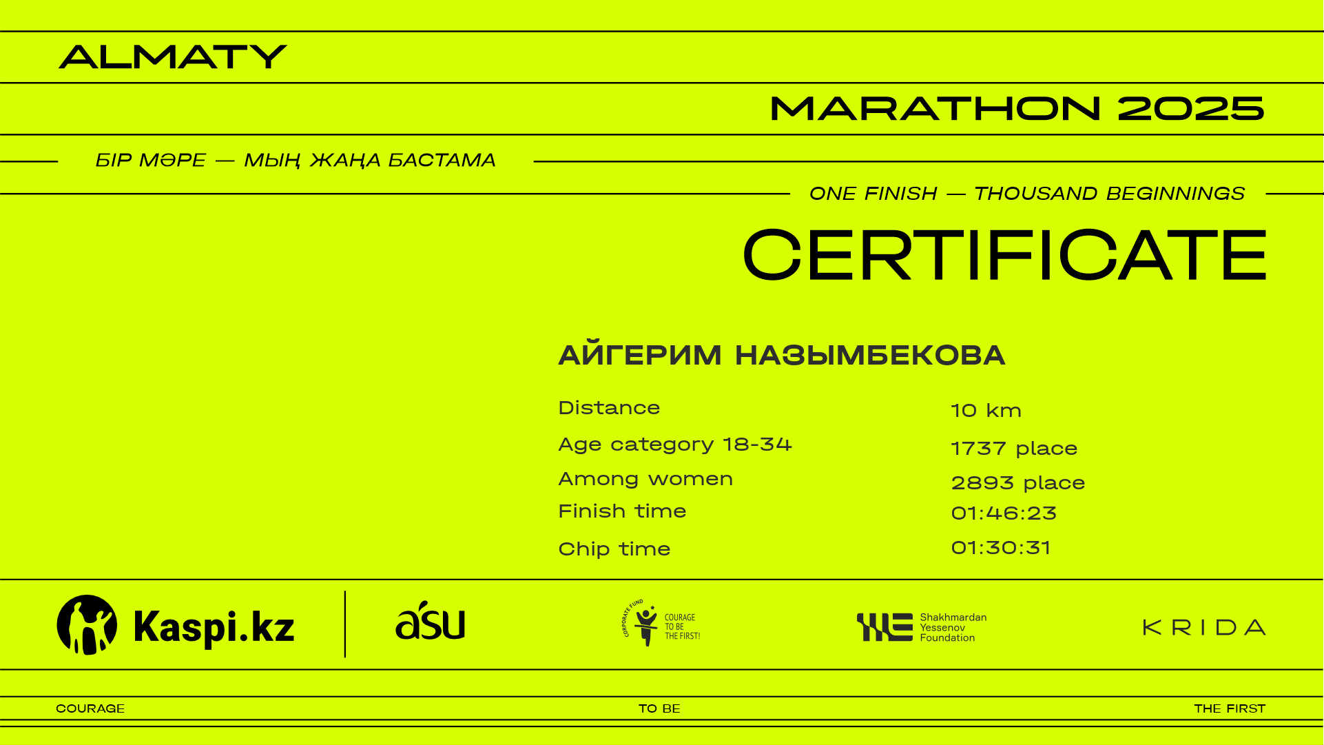 | 2866 | Назерке Ануарбек | ![]() | Алматы | 10854 | 01:18:45 | 01:32:56 | 01:30:00 | Download |