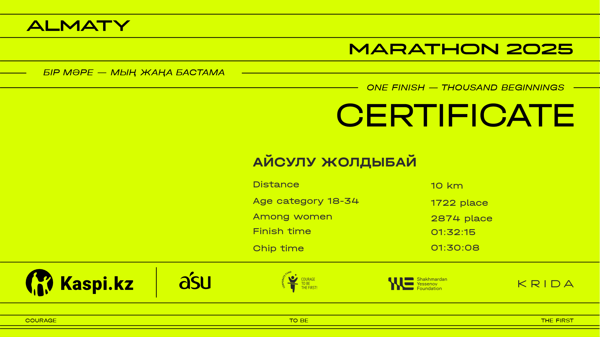 | 2874 | Айсулу Жолдыбай | ![]() | Алматы | 8019 | 01:18:02 | 01:32:15 | 01:30:08 | Download |