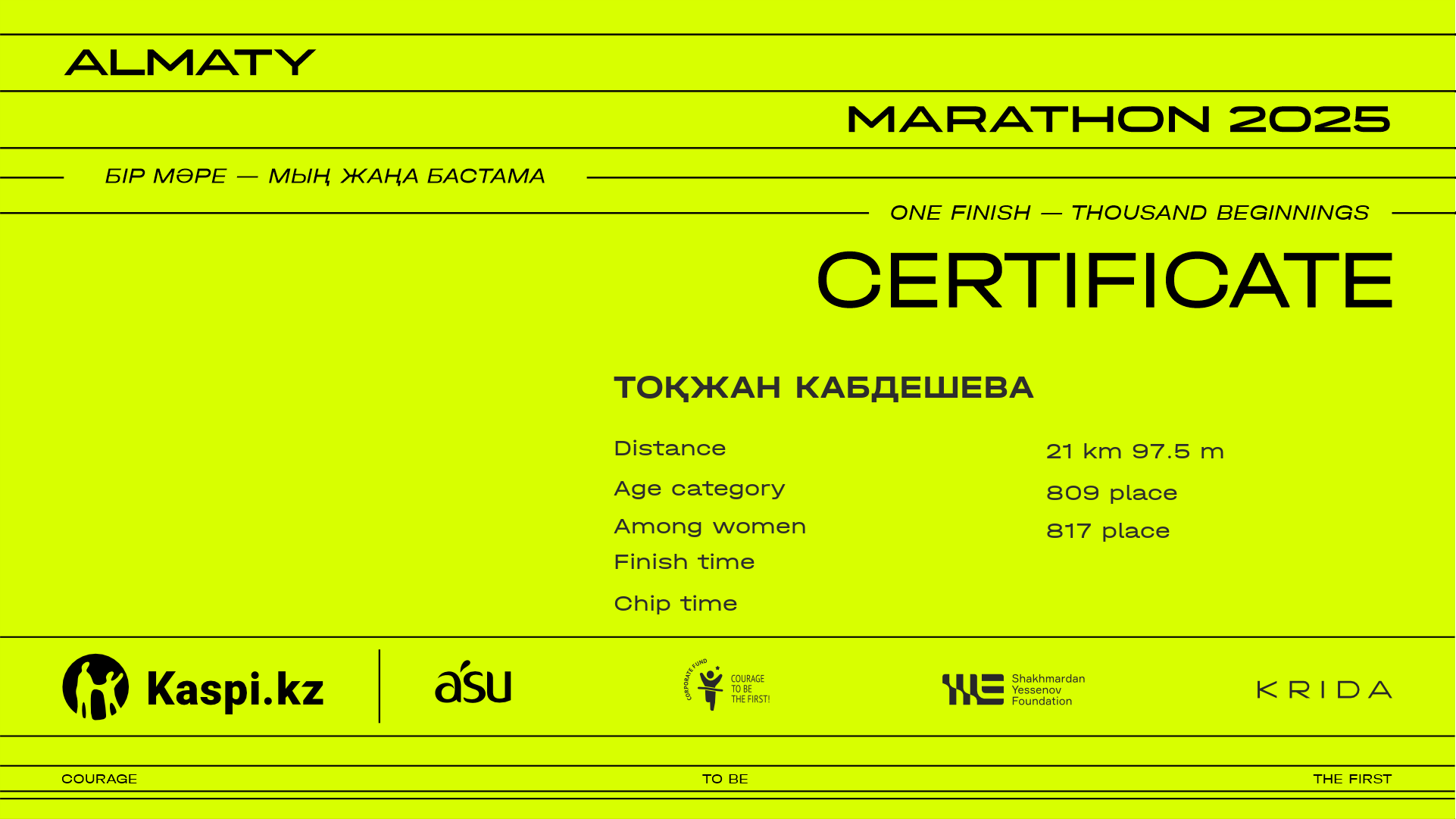 | 2987 | Динара Джармуханова | ![]() | Алматы | 2312 | 00:41:13 | 01:18:42 | 01:53:45 | 02:34:00 | 02:42:49 | 02:40:51 | Download |