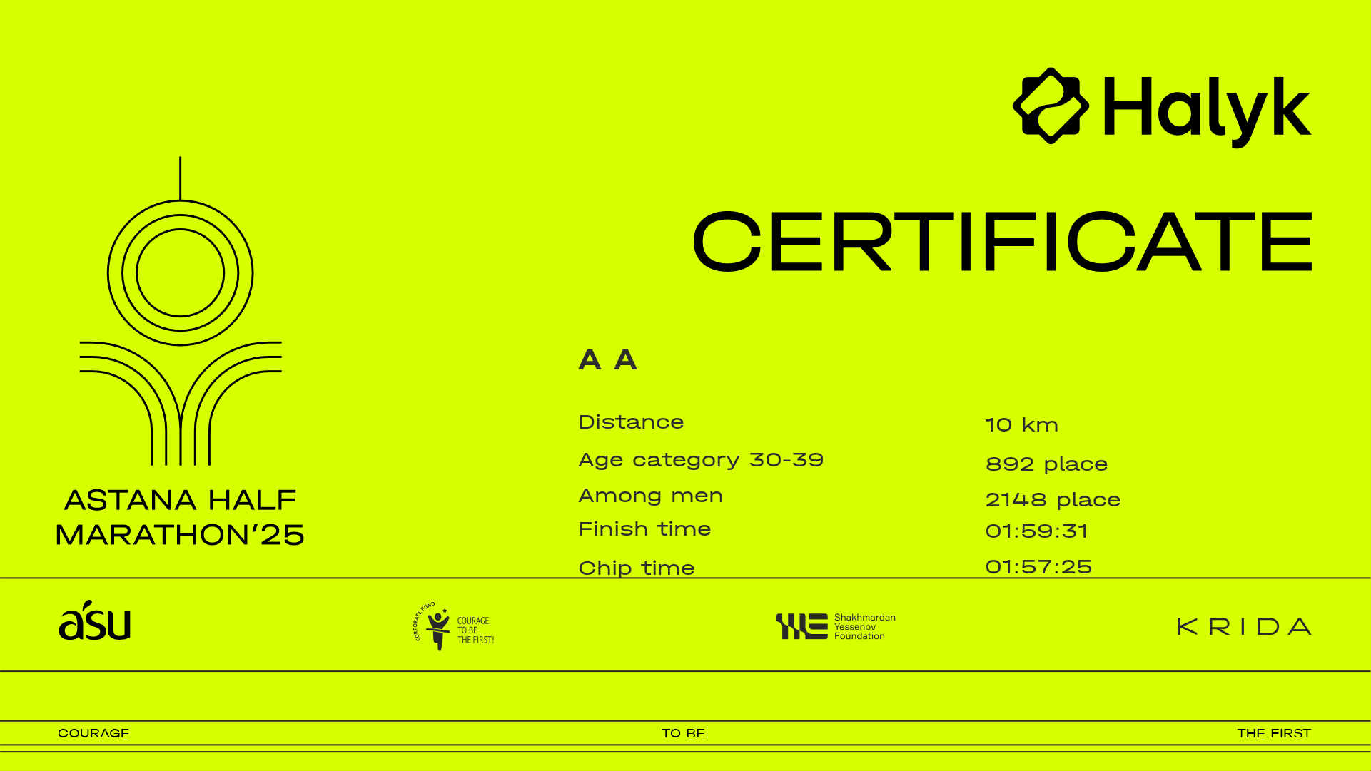 | 3729 | Айдана Абжанова | ![]() | Астана | 6294 | 00:56:10 | 01:50:13 | 01:49:22 | Download |
