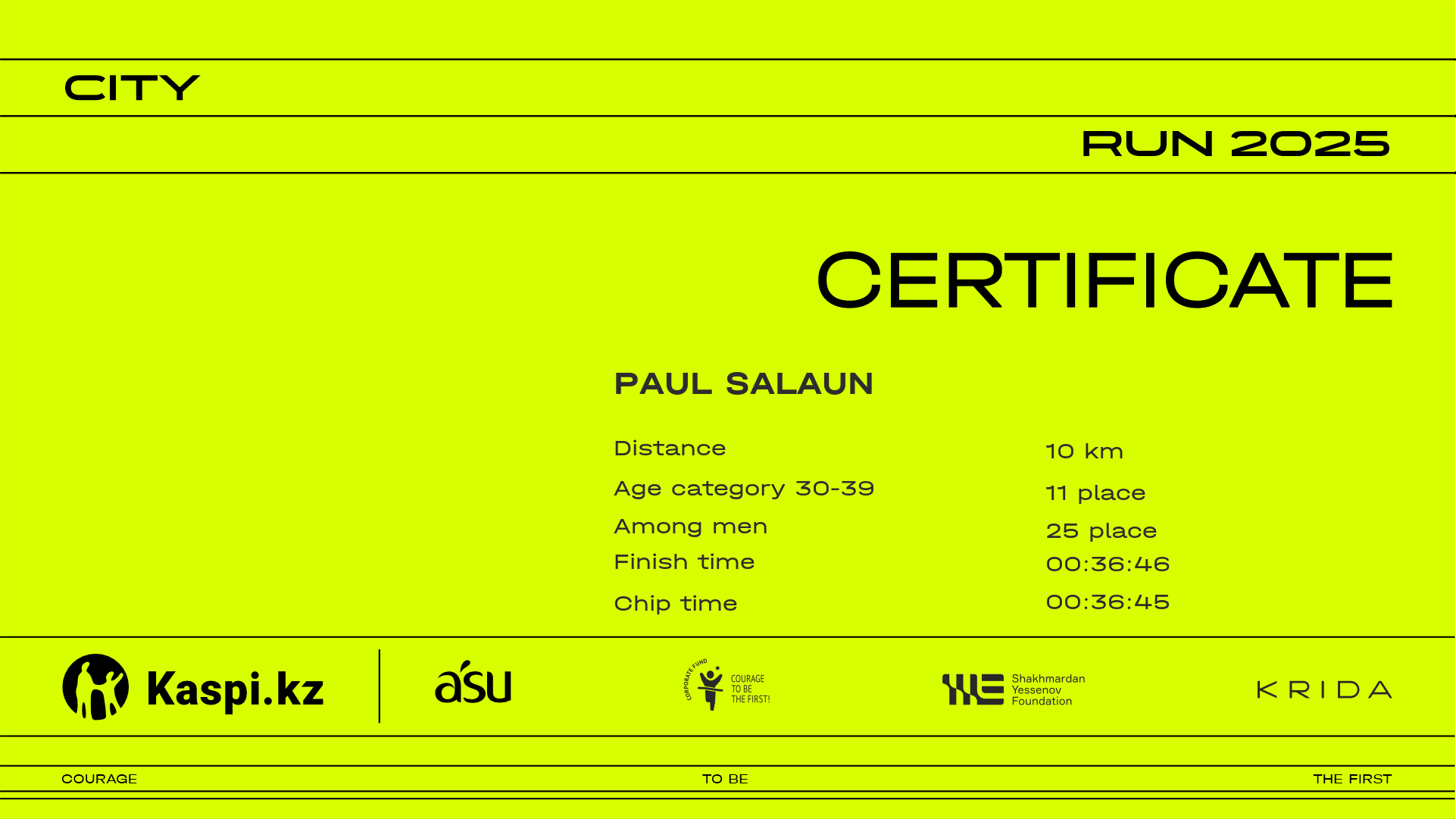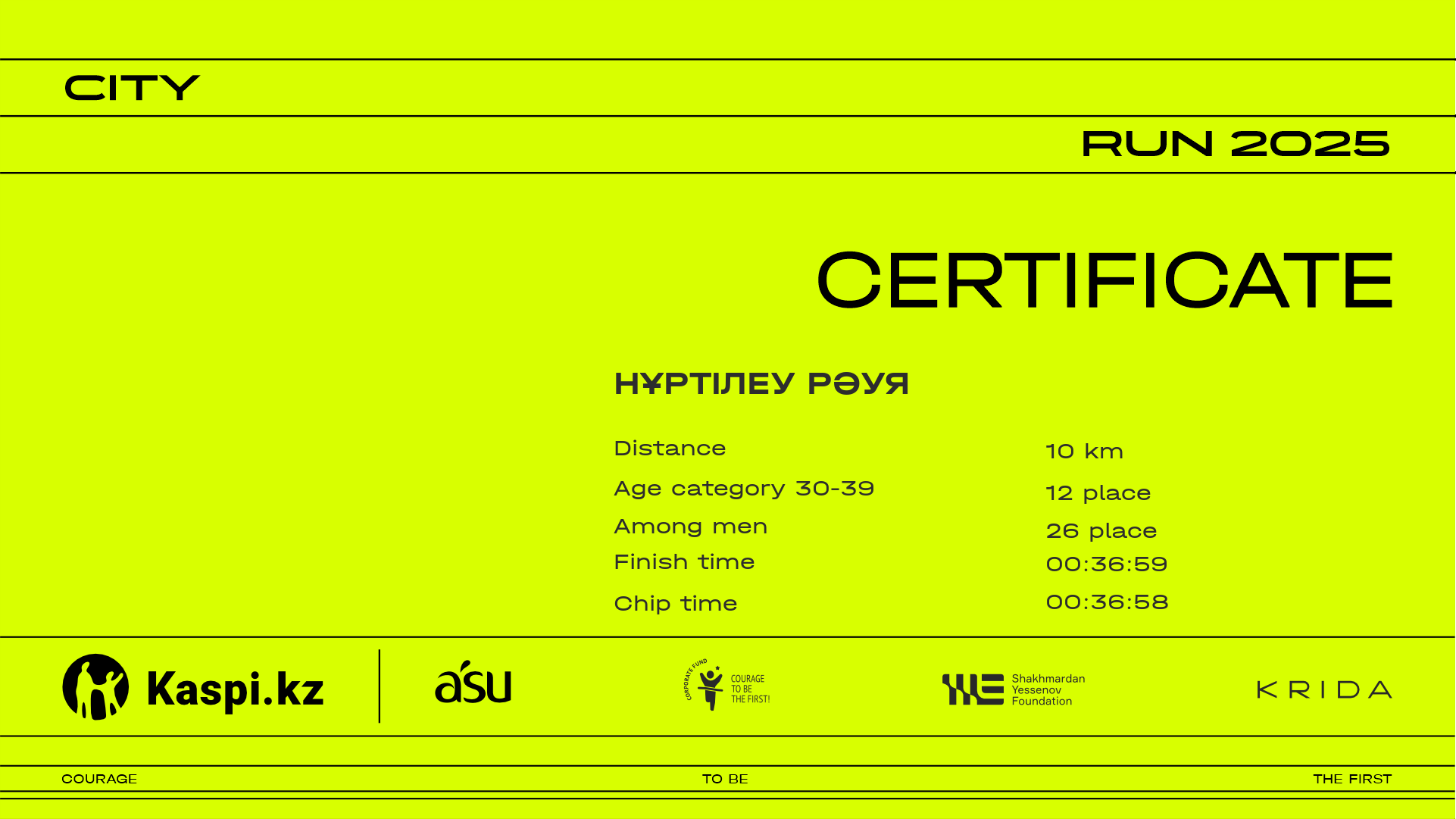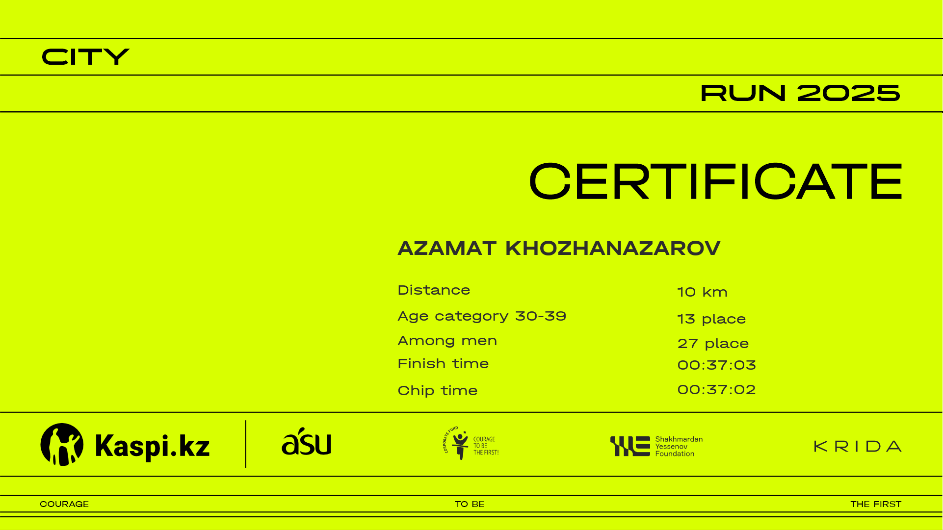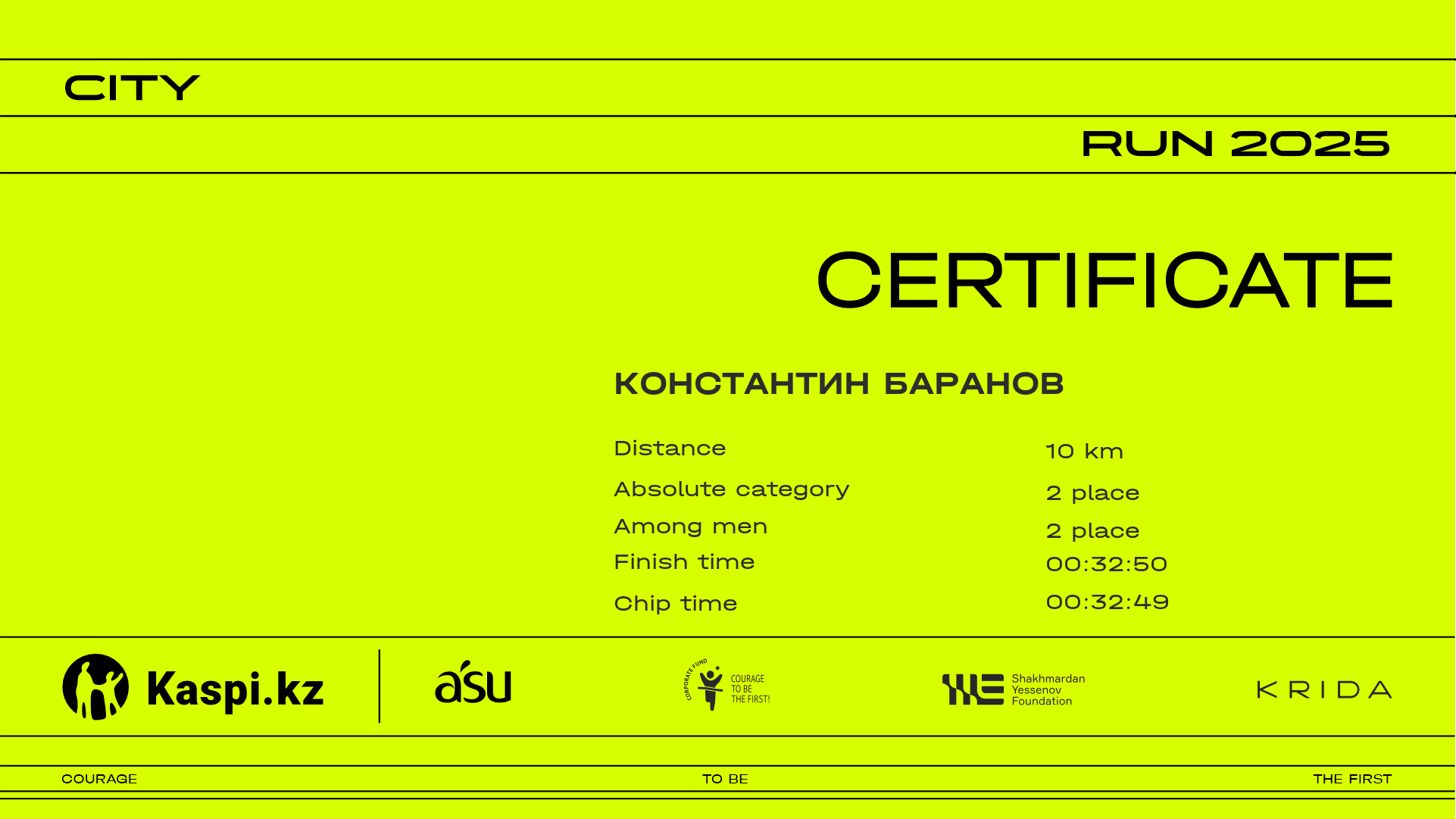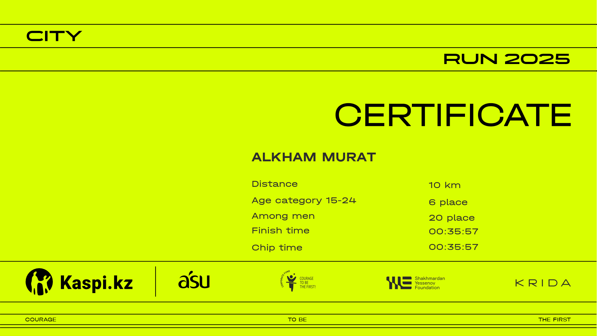 | 5 | Akimzhan Yelekenov | ![]() | Almaty | 1120 | 00:08:25 | 00:14:30 | 00:21:10 | 00:27:58 | 00:32:55 | 00:33:42 | 00:33:41 | Download |